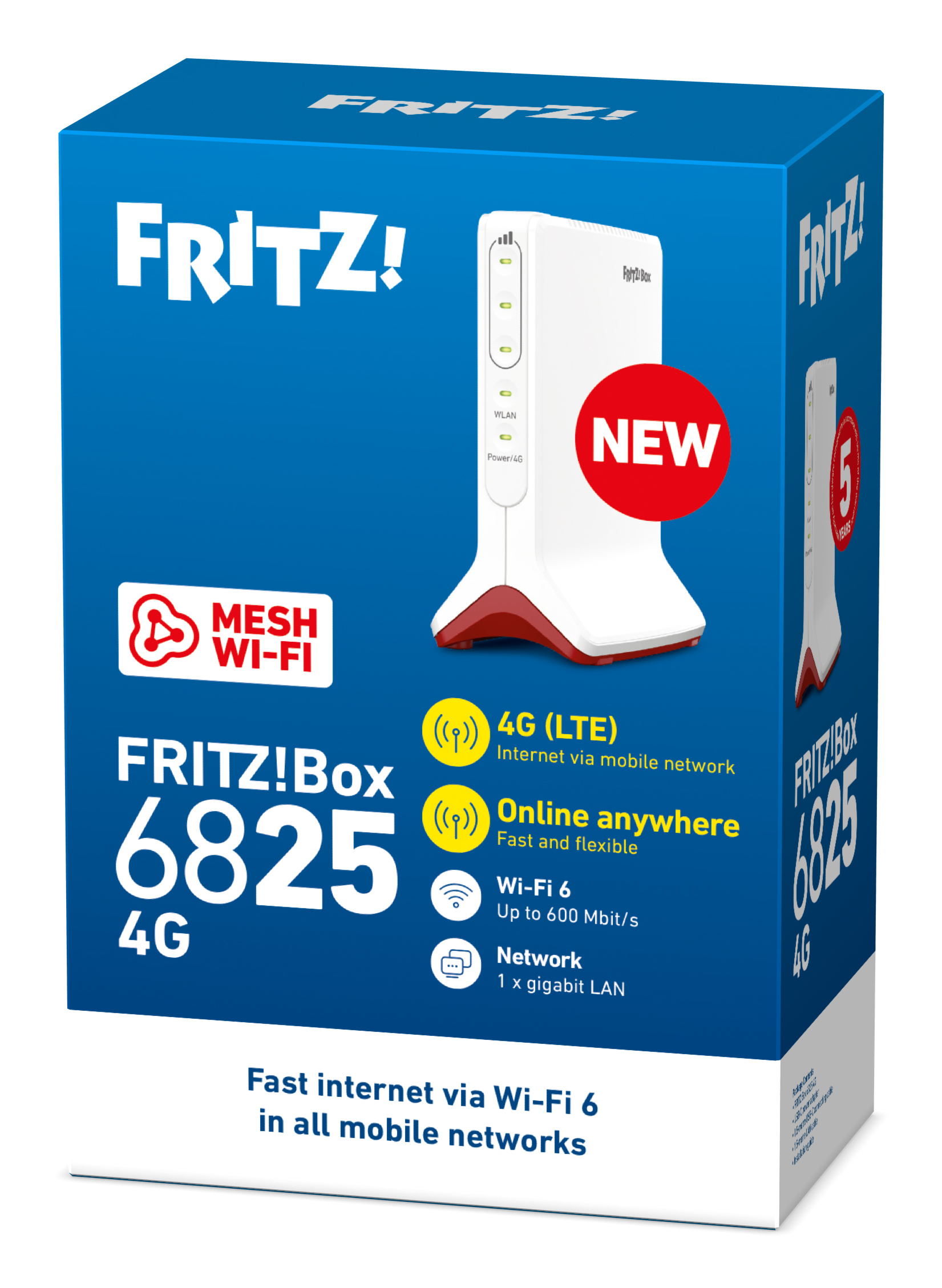 | Contenuto della confezione | •FRITZ!Box 6825 4G Edition International •USB-C power adapter •USB-C connecting cable, 1.5 m •LAN cable, 1.5 m •Quick guide in DE, EN, ES, FR, NL, IT, PL •Service card (FRITZ! Notes) |