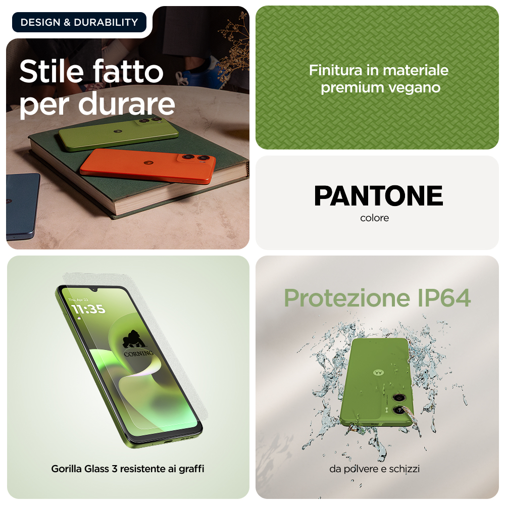 Ecco moto g06, un telefono progettato per andare oltre le tue aspettative. Guarda i tuoi programmi e film preferiti su un ampio e luminoso display 6,88", il nostro più grande di sempre su moto g, con altoparlanti stereo e audio Dolby Atmos®. Scatta foto straordinarie con qualsiasi condizione di luce utilizzando un sistema di fotocamere da 50 MP con tecnologia AI.(1) Ottieni multitasking super efficiente con fino a 12 GB di RAM utilizzando RAM Boost.(2,5,6,10) Goditi la tranquillità grazie alle caratteristiche di resistenza avanzata e a un design premium, che include la protezione dall'acqua IP64(3), Corning® Gorilla® Glass 3 e finitura in materiale premium vegano. Goditi 2 giorni con una singola ricarica.(4) E vivi esperienze Moto esclusive che rendono il tuo telefono più sicuro, personale e divertente. Inoltre, cerca immediatamente tutto ciò che vedi sul tuo telefono con Cerchia per cercare. Ottieni di più con moto g06.