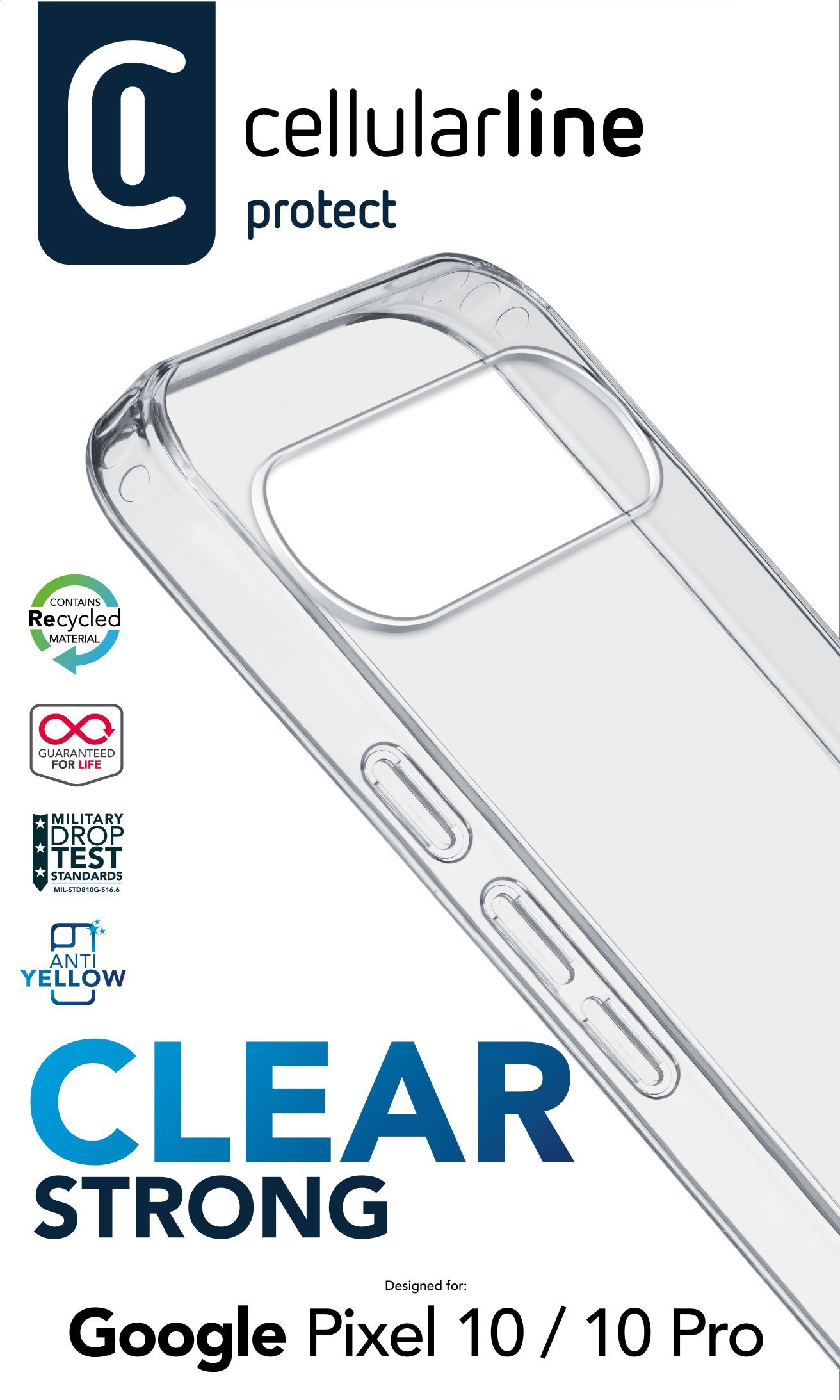Cellularline Clear Strong - Pixel 10 Custodia rigida con bordi in gomma. Tipologia custodia: Cover, Compatibilità marca: Universale, Compatibilità: Pixel 10, Capienza massima dimensioni dello schermo: 16 cm (6.3"), Colorazione superficie: Monocromatico, Colore del prodotto: Trasparente