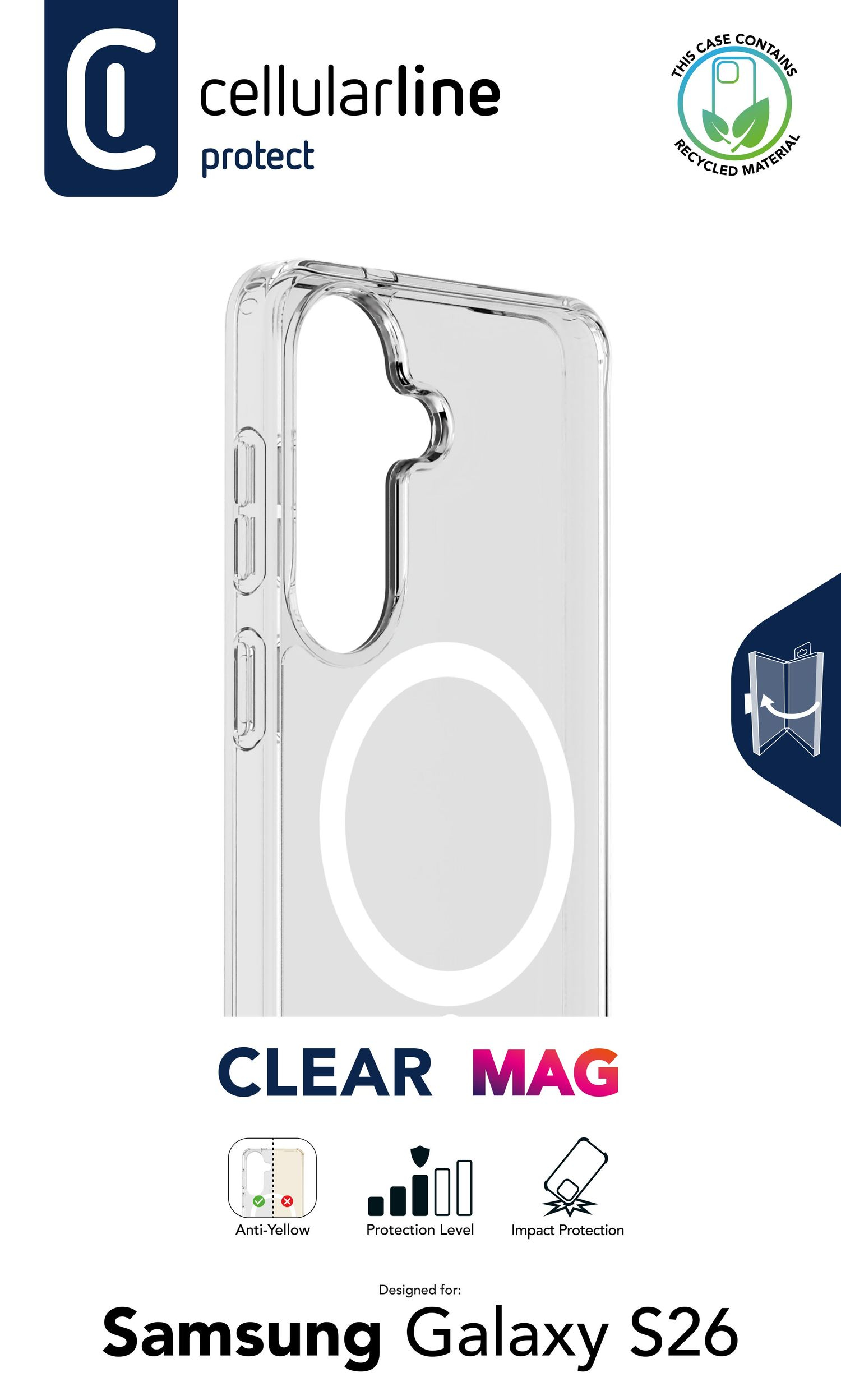 Cellularline Clear Mag - Galaxy S26 Custodia trasparente ultra resistente con bordo in gomma, compatibile con ecosistema Qi2 e accessori magnetici, trattata contro l’ingiallimento.. Tipologia custodia: Cover, Compatibilità marca: Samsung, Compatibilità: Galaxy S26, Capienza massima dimensioni dello schermo: 17 cm (6.7"), Colore del prodotto: Trasparente