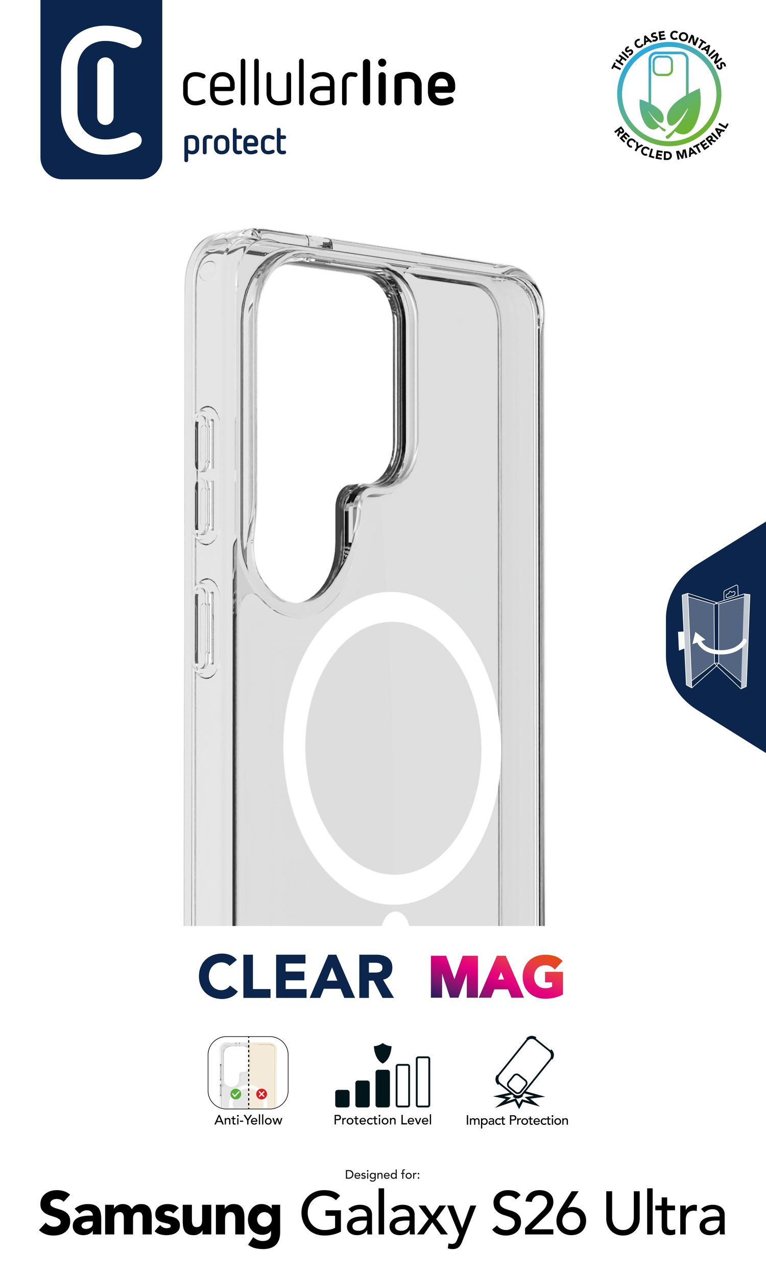Cellularline Clear Mag - Galaxy S26 Ultra Custodia trasparente ultra resistente con bordo in gomma, compatibile con ecosistema Qi2 e accessori magnetici, trattata contro l’ingiallimento.. Tipologia custodia: Cover, Compatibilità marca: Samsung, Compatibilità: Galaxy S26 Ultra, Capienza massima dimensioni dello schermo: 17,5 cm (6.9"), Colore del prodotto: Trasparente