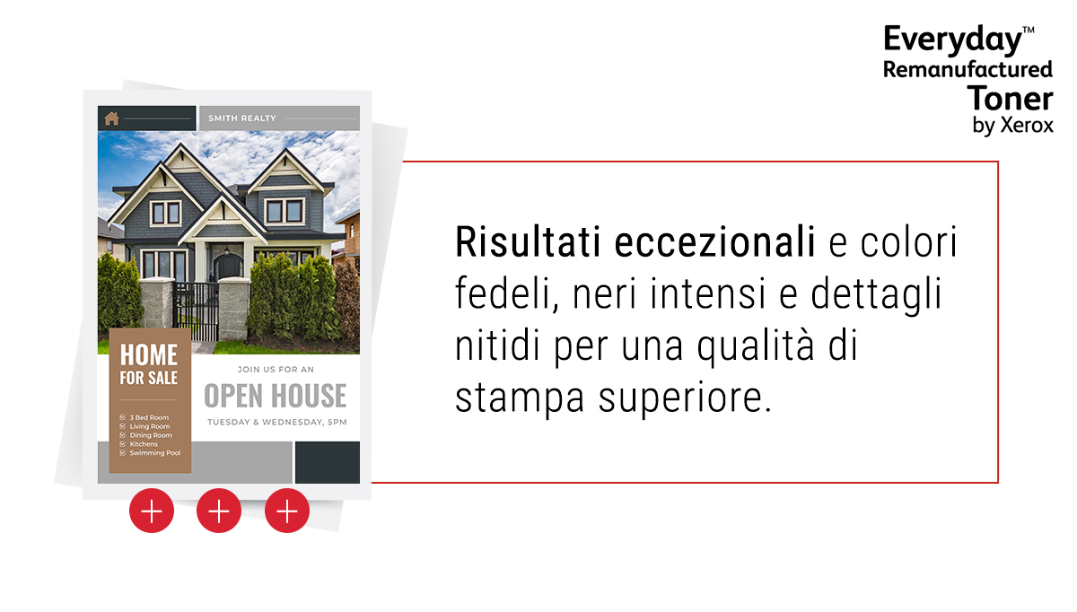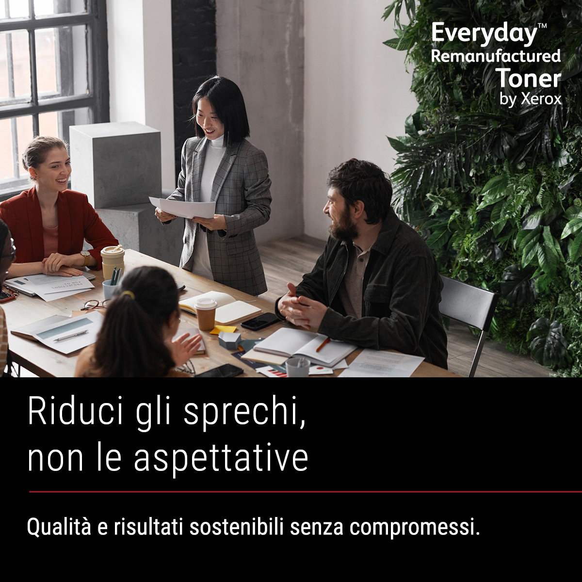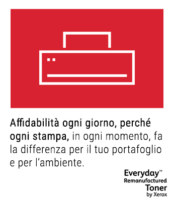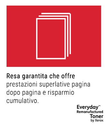 Un impegno di responsabilità ambientale rappresenta l’approccio migliore dal punto di vista commerciale, per il suo impatto positivo sul pianeta, sull’azienda e sulle persone. Il Toner rigenerato Everyday di Xerox produce un’impronta di carbonio minore rispetto a qualsiasi altra cartuccia di toner a singolo utilizzo. Perché non si dovrebbe essere obbligati a scegliere tra fare la propria parte per ridurre l’impatto sull’ambiente e il costo del toner. E la compatibilità con le marche di stampanti più diffuse ti permette di usufruire dell’impareggiabile qualità e impegno ambientale di Xerox indipendentemente dalla stampante che utilizzi.