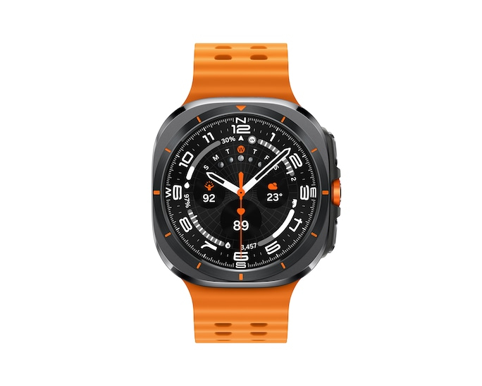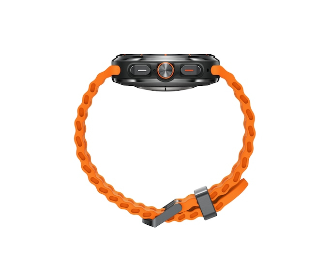 Samsung Galaxy Watch Ultra. Dimensioni diagonale schermo: 3,81 cm (1.5"), Tecnologia display: AMOLED, Risoluzione del display: 480 x 480 Pixel, Touch screen. Capacità RAM: 2000 MB, Memoria flash: 64 GB. Wi-Fi. GPS (satellitare). Capacità della batteria: 590 mAh. Peso: 60,5 g. Colore cinturino: Arancione. Sistema operativo incluso: Wear OS