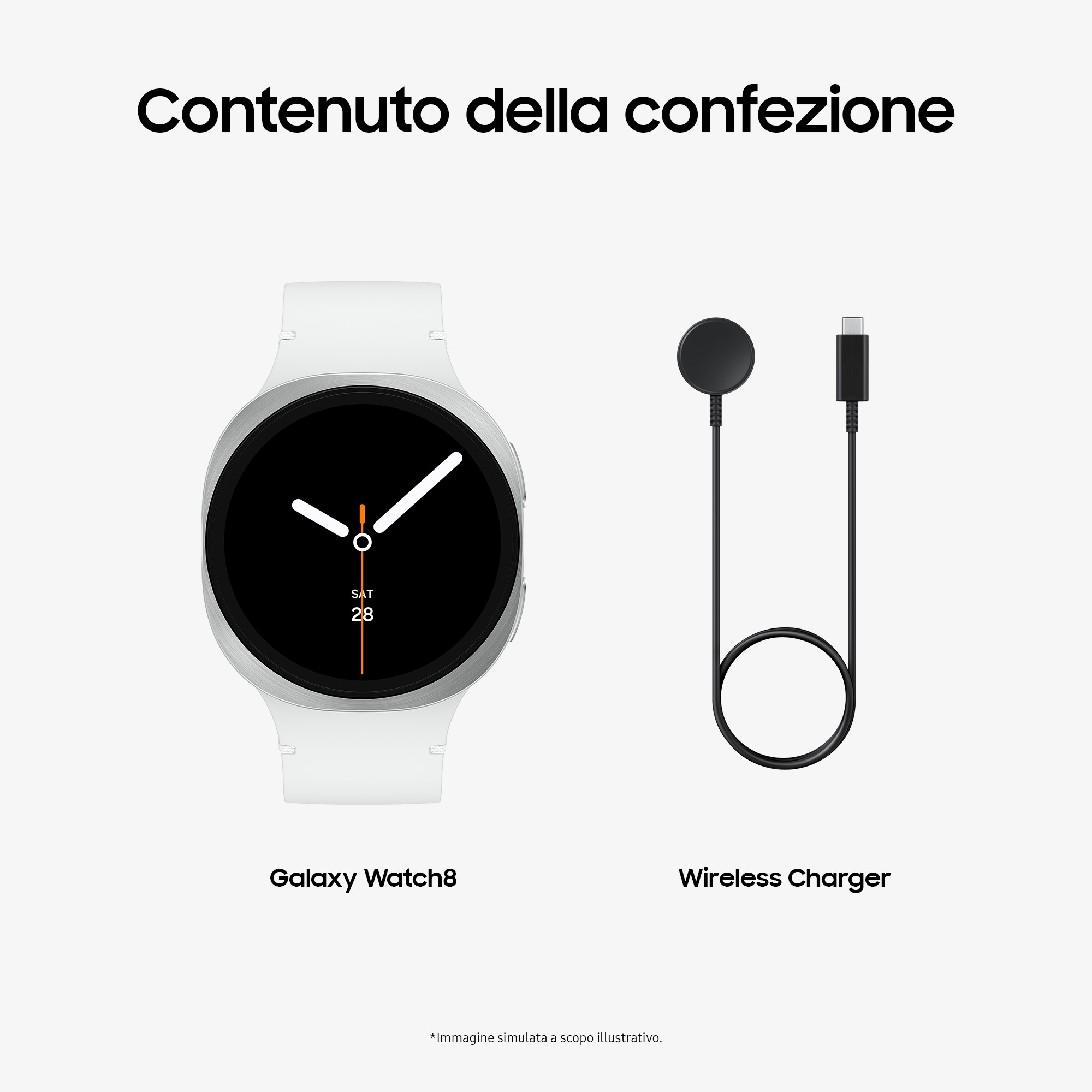 Samsung Galaxy Watch8 Galaxy Watch 8, Bluetooth, 44mm. Dimensioni diagonale schermo: 3,81 cm (1.5"), Tecnologia display: AMOLED, Risoluzione del display: 480 x 480 Pixel, Touch screen. Capacità RAM: 2000 MB, Memoria flash: 32 GB. Wi-Fi. GPS (satellitare). Capacità della batteria: 435 mAh. Peso: 34 g. Sistema operativo incluso: Wear OS
