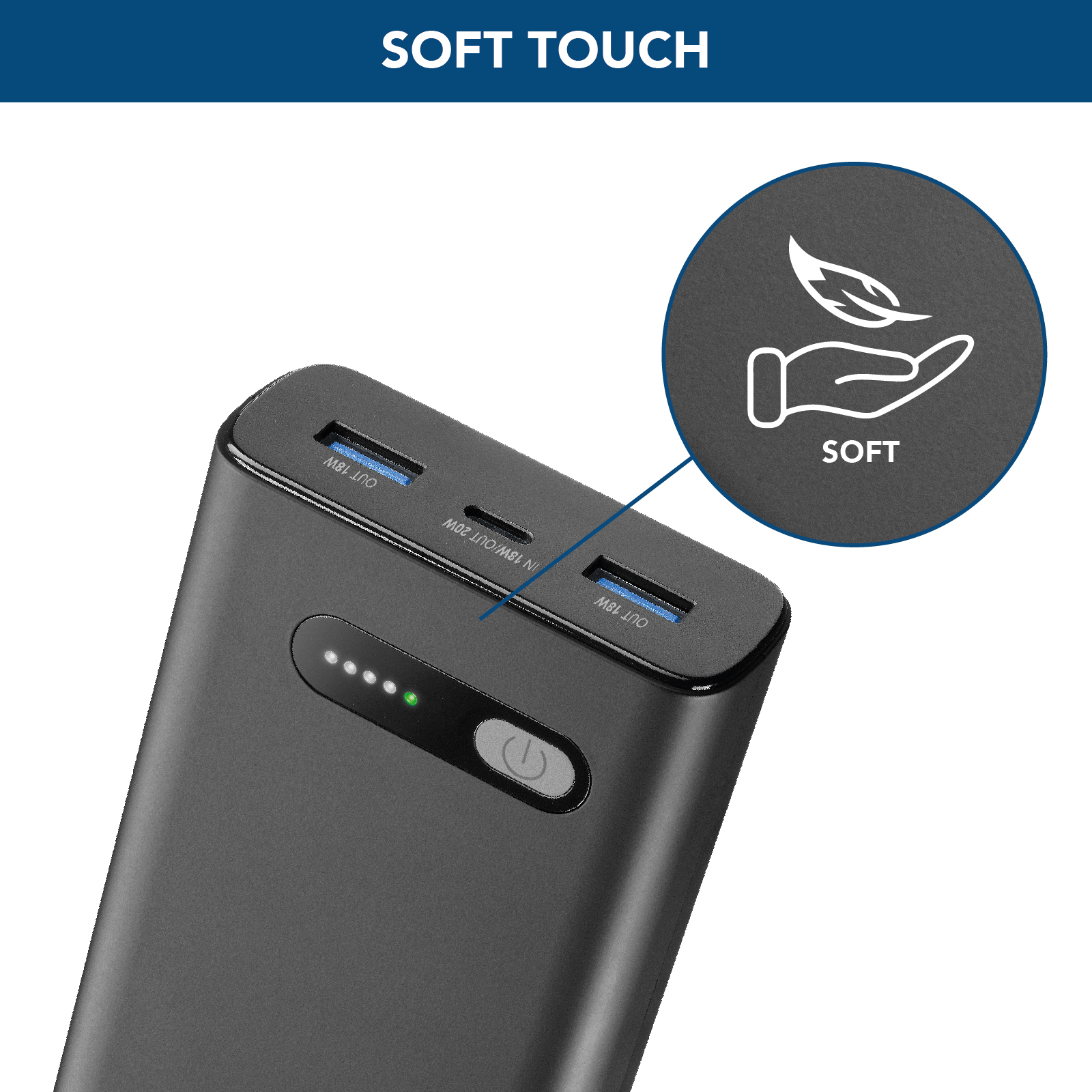 Il caricabatterie portatile FAST PD 20000 è la soluzione ideale per chi cerca potenza e praticità in un unico dispositivo. Con una capacità di 20000mAh, offre fino a 144 ore di ricarica extra per i tuoi smartphone, permettendoti di affrontare lunghi viaggi o giornate intense senza preoccuparti della batteria. Dotato di una porta USB-C con output da 20W e input da 18W, insieme a due porte USB da 18W ciascuna, garantisce una ricarica rapida e simultanea per un massimo di tre dispositivi. Grazie ai LED luminosi integrati, potrai monitorare facilmente lo stato di carica residua. Il design moderno è stato studiato per offrire il massimo comfort: la verniciatura antiscivolo e il rivestimento soft touch rendono la presa sicura e piacevole al tatto, offrendo non solo elevate prestazioni, ma anche una piacevole esperienza d'uso.