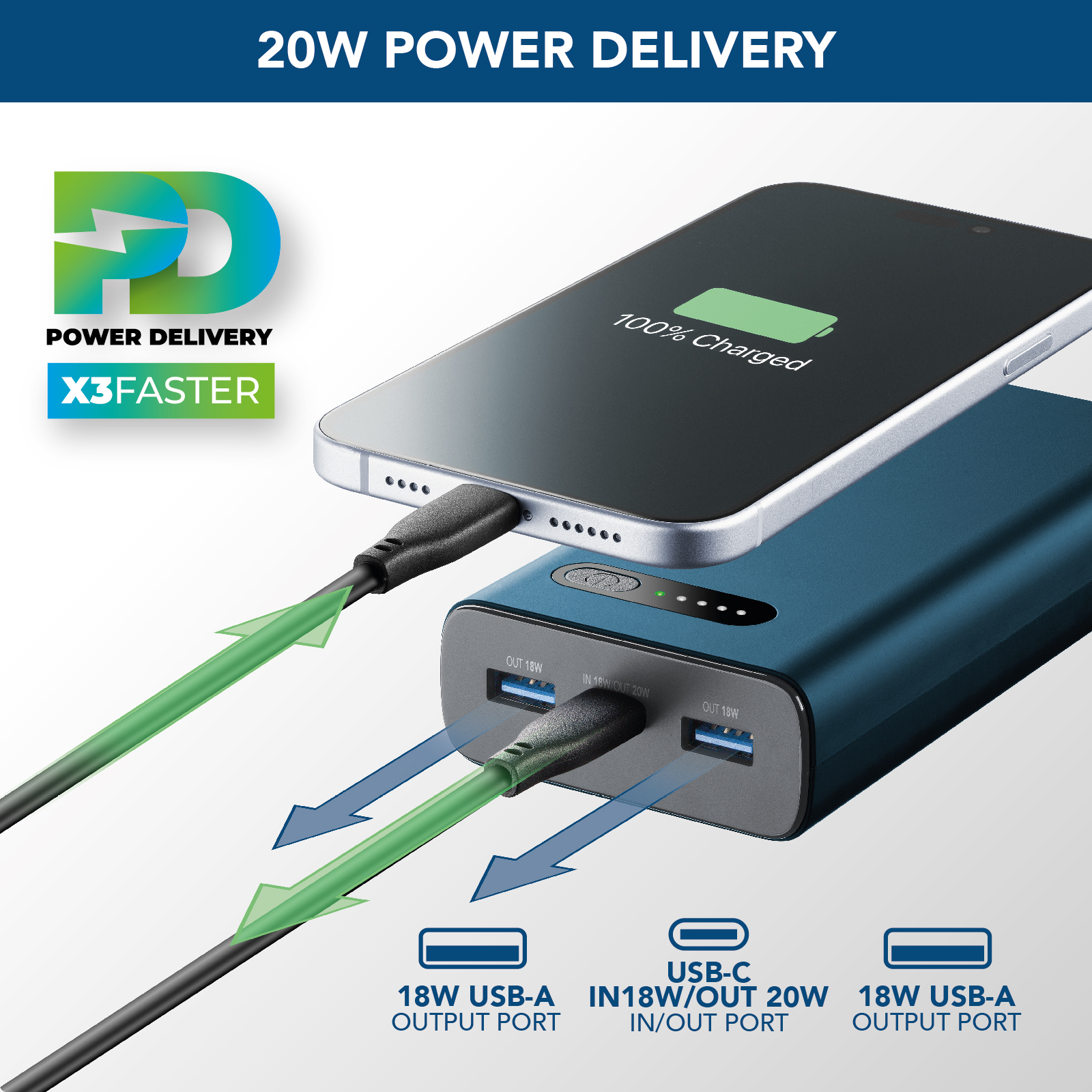Il caricabatterie portatile FAST PD 20000 è la soluzione ideale per chi cerca potenza e praticità in un unico dispositivo. Con una capacità di 20000mAh, offre fino a 144 ore di ricarica extra per i tuoi smartphone, permettendoti di affrontare lunghi viaggi o giornate intense senza preoccuparti della batteria. Dotato di una porta USB-C con output da 20W e input da 18W, insieme a due porte USB da 18W ciascuna, garantisce una ricarica rapida e simultanea per un massimo di tre dispositivi. Grazie ai LED luminosi integrati, potrai monitorare facilmente lo stato di carica residua. Il design moderno è stato studiato per offrire il massimo comfort: la verniciatura antiscivolo e il rivestimento soft touch rendono la presa sicura e piacevole al tatto, offrendo non solo elevate prestazioni, ma anche una piacevole esperienza d'uso.