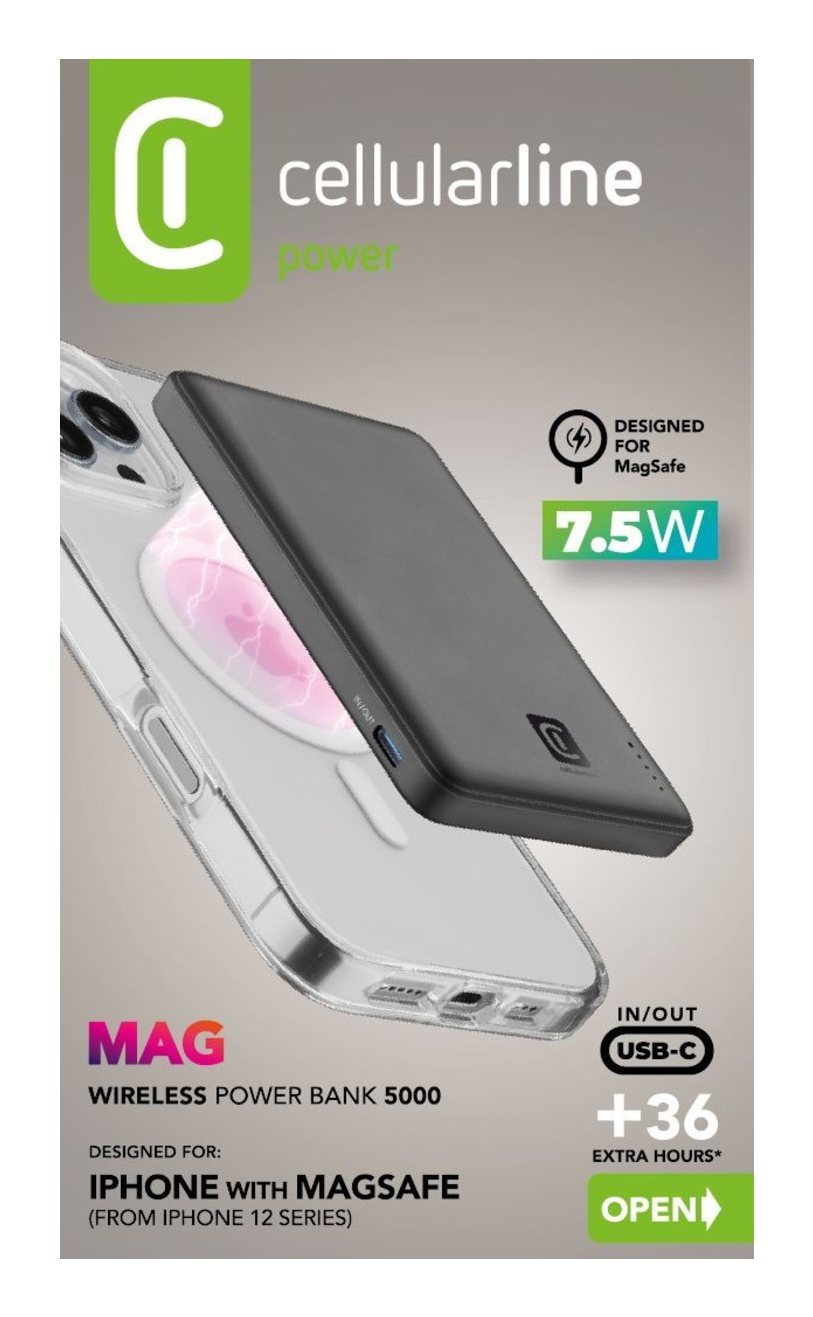 Cellularline Power Bank MAGSAFE 5000 Power Bank MagSafe 5.000 è il caricabatterie wireless e portatile con tecnologia MagSafe da 7.5W. Grazie al suo design compatto e finiture soft touch, è perfetto per chi cerca una ricarica veloce e senza fili.. Capacità della batteria: 5000 mAh, Carica wireless. Colore del prodotto: Nero