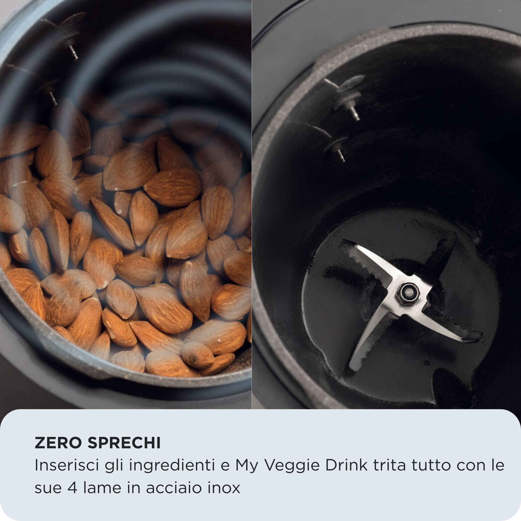Grazie alla lavorazione delle 4 lame in acciaio inox, My Veggie Drink trita tutti gli ingredienti inseriti nel recipiente di lavorazione senza scarti e sprechi, per una bevanda 100% naturale e ricca di nutrienti.Non dovrai più comprare grandi confezioni per paura di rimanere senza, né gettare via gli avanzi. Prepara solo la quantità di bevanda vegetale di cui hai bisogno al momento: che sia un bicchiere per la colazione o una caraffa , My Veggie Drink ti permette di produrre la dose perfetta, riducendo drasticamente gli scarti alimentari e usando solo i tuoi ingredienti preferiti.
