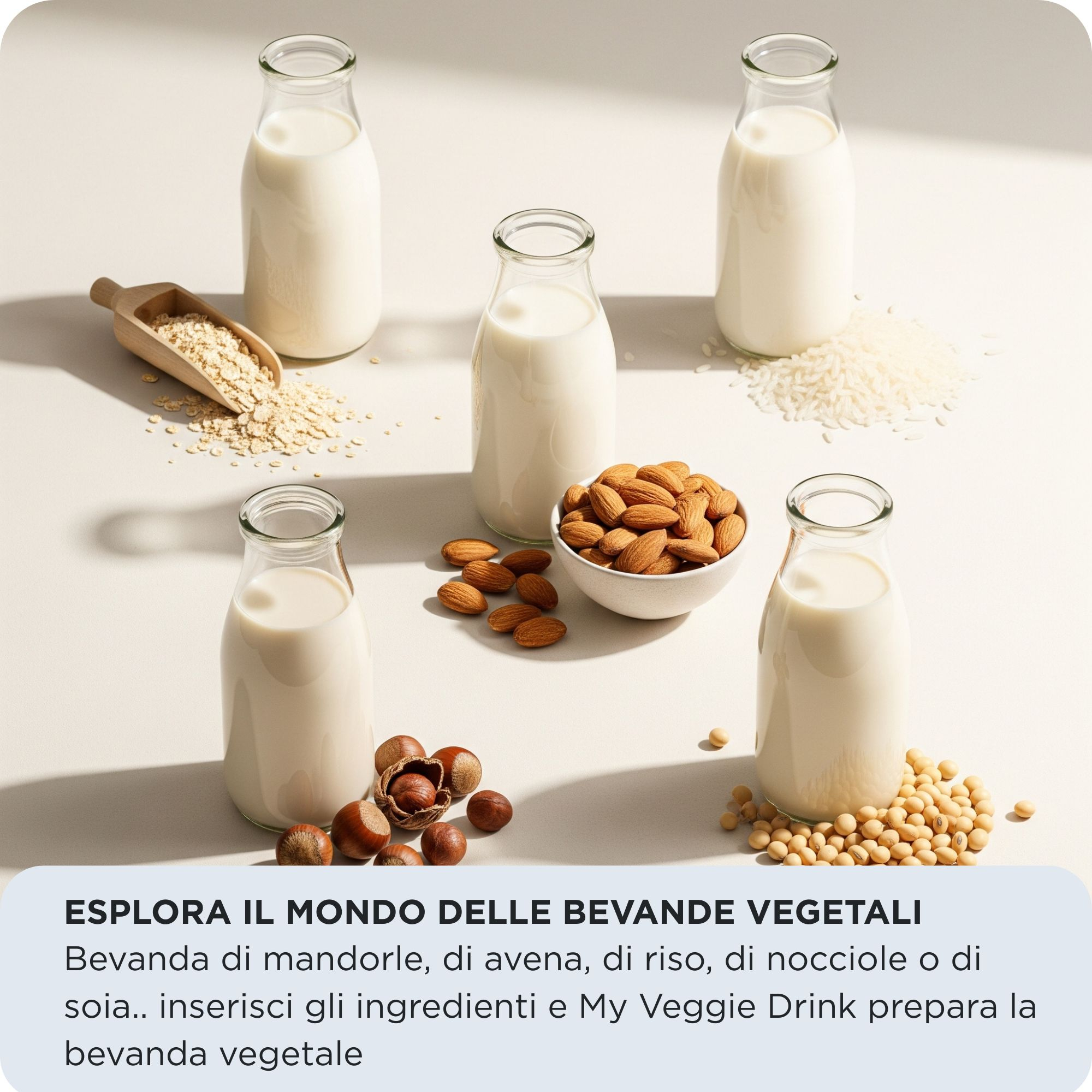Desideri un’alternativa al latte? Il dilemma è finito! Con My Veggie Drink, la macchina per preparare bevande vegetali, puoi dire addio alle scelte difficili e iniziare a creare le tue bevande preferite direttamente a casa.. ogni giorno!Scegli i tuoi ingredienti preferiti (fiocchi d’avena, riso, soia, nocciole, mandorle) inserisci gli ingredienti nel recipiente per la lavorazione dotato di 4 potenti lame in acciaio inox e rivestimento in ceramica antiaderente. Dal display touch scegli tra i 6 programmi a disposizione quello che preferisci e My Veggie Drink inizierà la preparazione della tua bevanda e sarà velocissima: in appena 15 minuti avrai il tuo drink vegetale pronto da gustare! Ogni giorno puoi provare una varietà nuova: che sia bevanda di avena, riso, soia, mandorla, smoothies golosi e gourmet, succhi di frutta e tanto altro, con My Veggie Drink la tua fantasia e creatività non avranno limiti!I tuoi drink vegetali saranno preparati con ingredienti naturali e con la sola aggiunta di acqua tramite il serbatoio da 1,5 L rimovibile. Una volta preparata la tua bevanda vegetale, My Veggie Drink inizierà il processo di autopulizia e auto asciugatura del recipiente di lavorazione affinchè la macchina sia sempre pronta all’uso senza alcuno sforzo o perdita di tempo