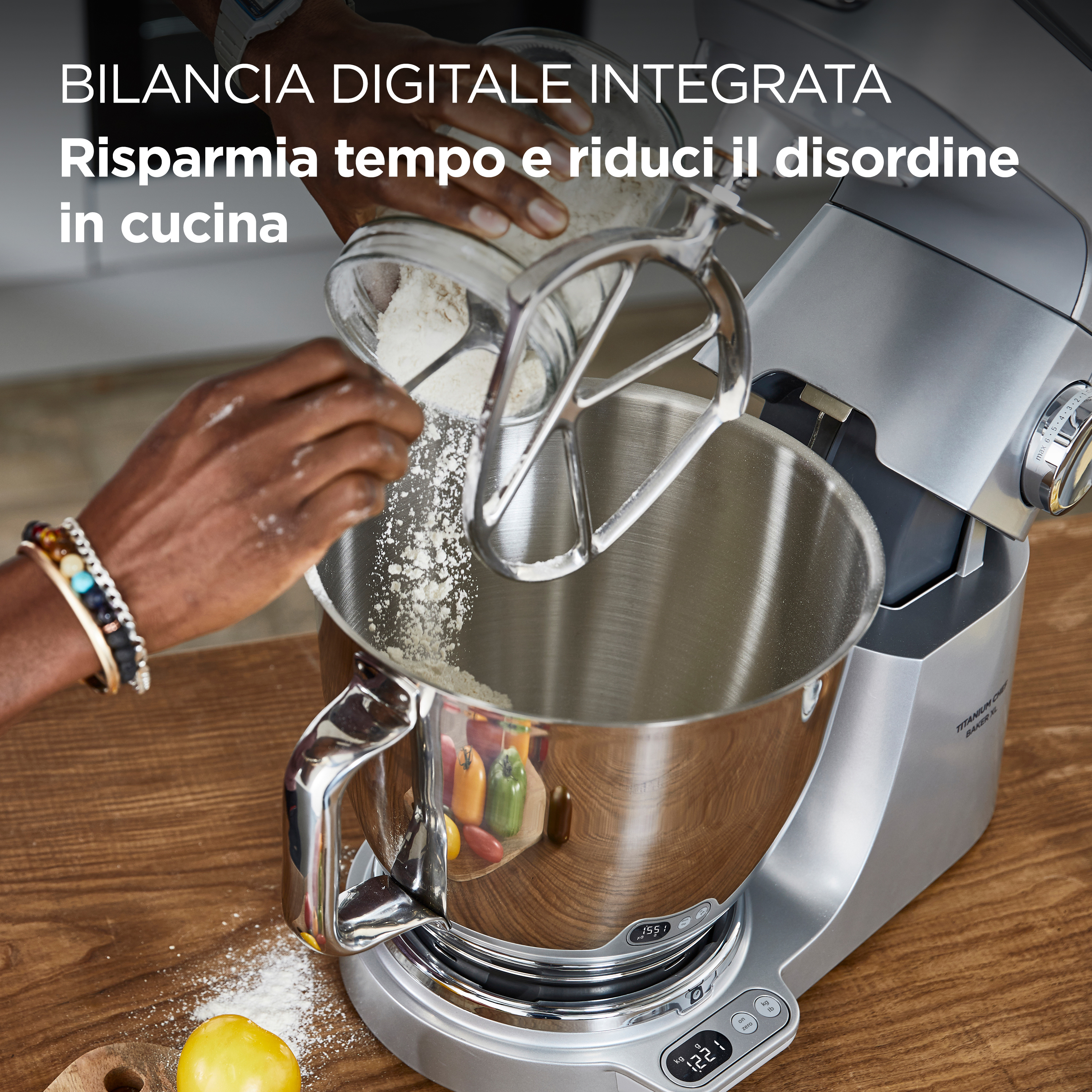 Titanium Chef Baker XL, la tua impastatrice che PESA. Motore 1200W, movimento planetario, ciotola capiente da 7l e ciotolaaggiuntiva da 5l, entrambe in acciaio inox, bilancia integrata, schermo LCD con timer, utensili per la miscelazione in acciaio inox che includono: frusta K, frusta a filo, gancio impastatore, frusta gommata con 2 guaine. In dotazione: Frullatore in vetro termoresistente. Cover PopTop intercambiabili.