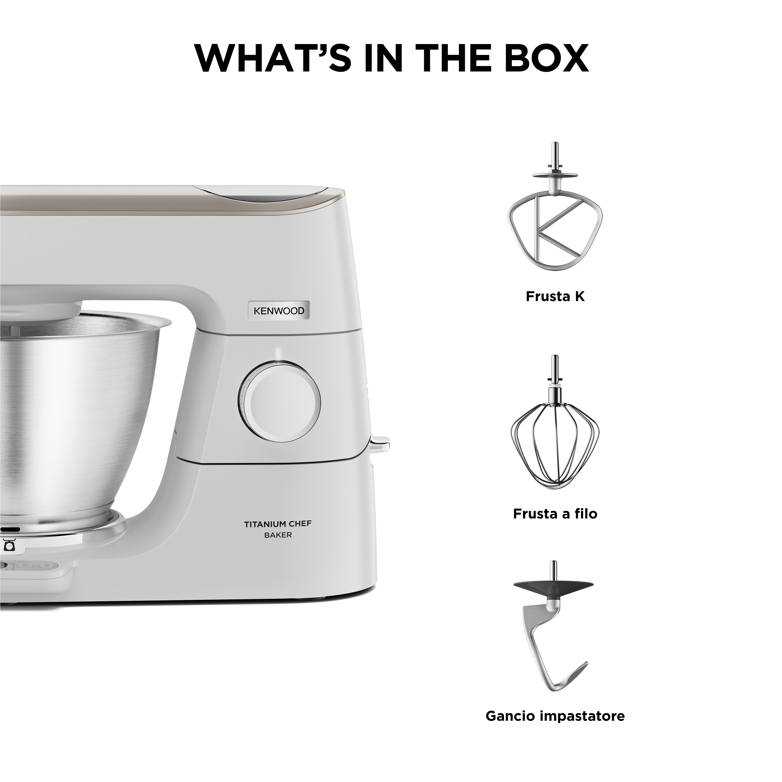 Titanium Chef Baker, la tua impastatrice che PESA. Finitura Silver, Motore 1200W, movimento planetario, ciotola capiente da 5L, bilancia integrata, schermo LCD con timer, utensili per la miscelazione in alluminio che includono: frusta K, frusta a filo, gancio impastatore. Cover PopTop™ opzionali intercambiabili.