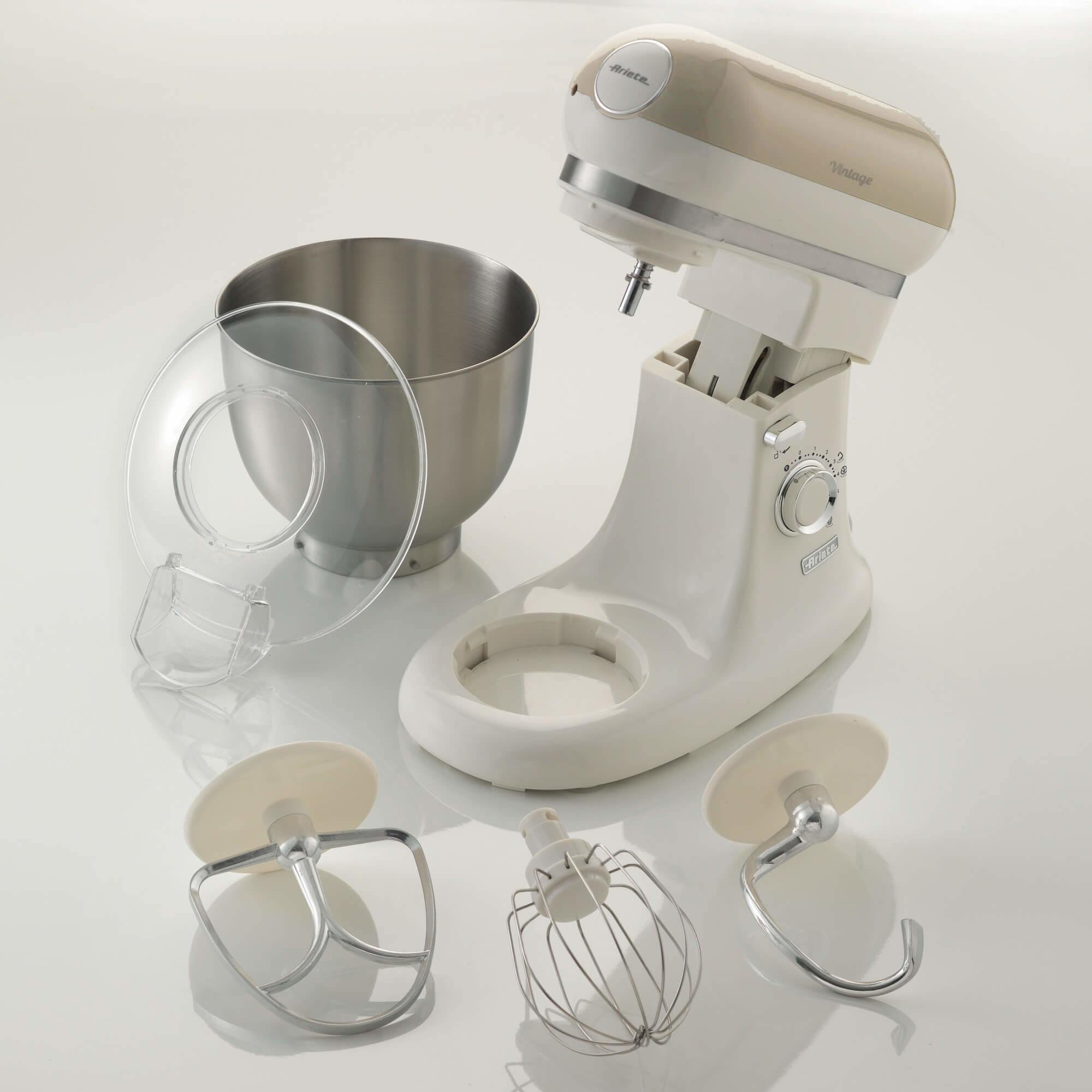 Ariete 1588 Impastatrice Planetaria - Pane, pizza e dolci - 7 Velocità - 3 Fruste - 5,5 Litri - Acciaio Inox - 2400 Watt - Linea Vintage - Beige. Tipo: Sbattitore con base, Colore del prodotto: Beige, Cromo, Bianco, Funzioni mixer: Impasto, Miscelatura. Materiale ciotola: Acciaio inox. Potenza: 1200 W, Tipologia alimentazione: AC. Larghezza: 285 mm, Profondità: 425 mm, Altezza: 385 mm. Peso dell'imballo: 7,58 kg