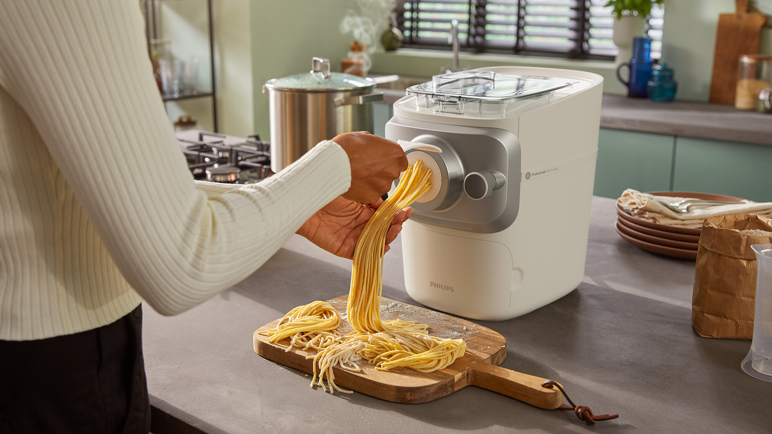 La macchina per pasta Philips 7000 ti aiuta a preparare una vasta gamma di gustosi piatti di pasta fatta in casa in meno di 10 minuti*. Grazie alla pulizia senza problemi e all'ampia capacità, è lo strumento ideale per gustare la pasta fresca con la famiglia e gli amici a casa in qualsiasi momento.