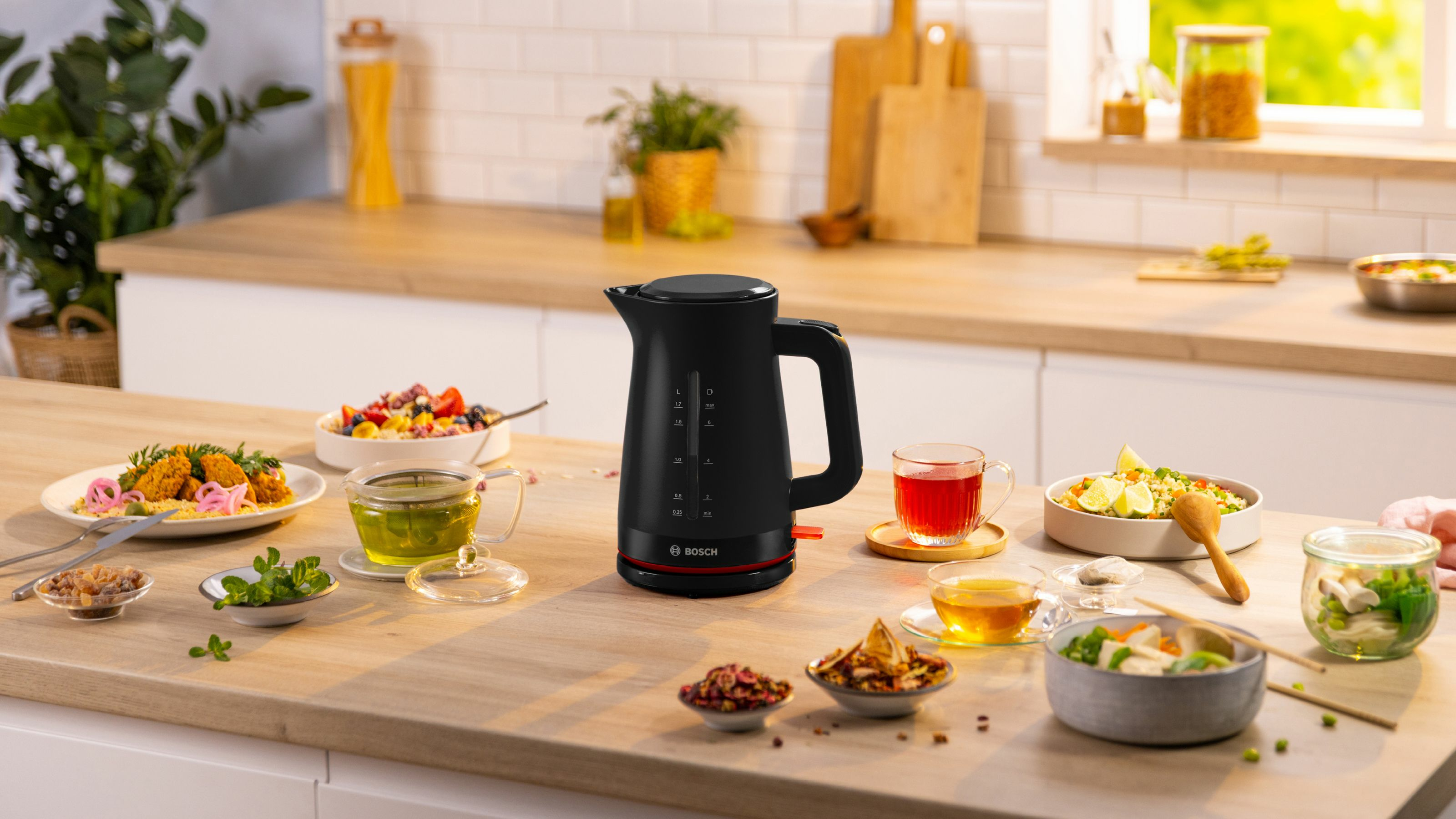 Il comodo bollitore maneggevole e con indicatore della tazza. L'entusiasmante design della superficie con riflessi opachi e lucidi dà vita alla cucina.
