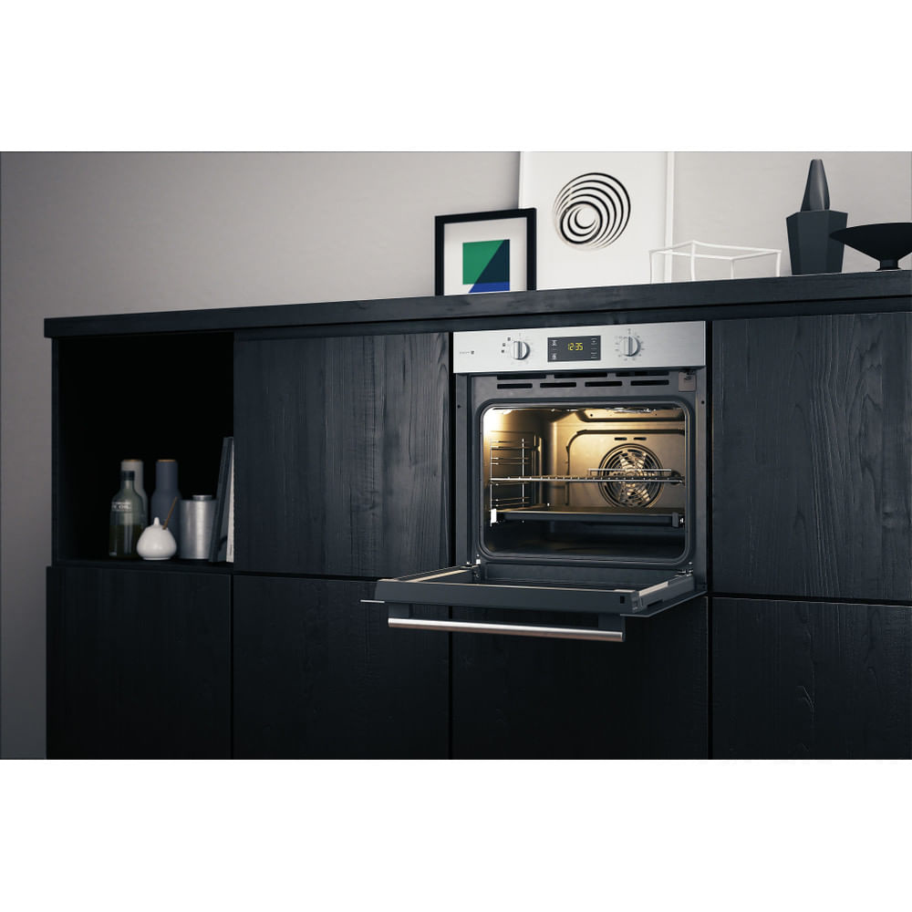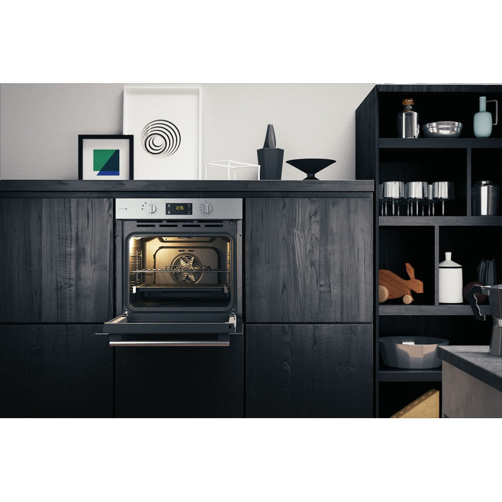Caratteristiche di questo forno da incasso Hotpoint Ariston: tecnologia autopulente, che utilizza un ciclo ad alta temperatura per trasformare in cenere i residui di cibo, consentendo di pulire facilmente con una spugna. Tecnologia elettrica avanzata per cucinare risparmiando energia.