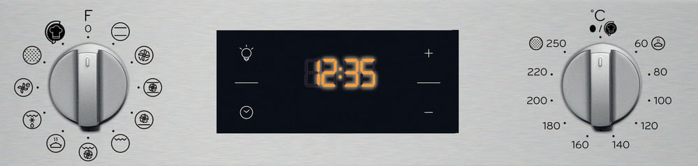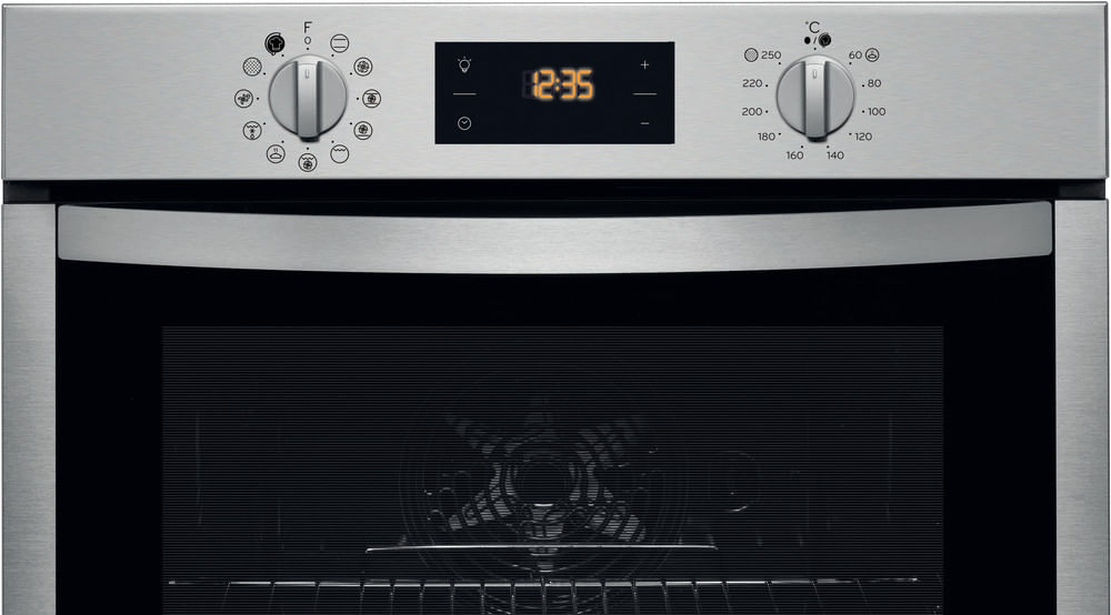 Forno ventilato con resistenza circolare attivata contemporaneamente. La ventola posizionata sul retro distribuisce uniformemente l'aria calda all'interno del forno e grazie a ciò è possibile cuocere pietanze diverse che richiedono la stessa temperatura.>