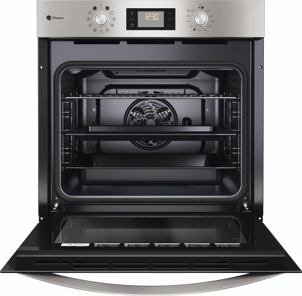 Forno ventilato con resistenza circolare attivata contemporaneamente. La ventola posizionata sul retro distribuisce uniformemente l'aria calda all'interno del forno e grazie a ciò è possibile cuocere pietanze diverse che richiedono la stessa temperatura.>