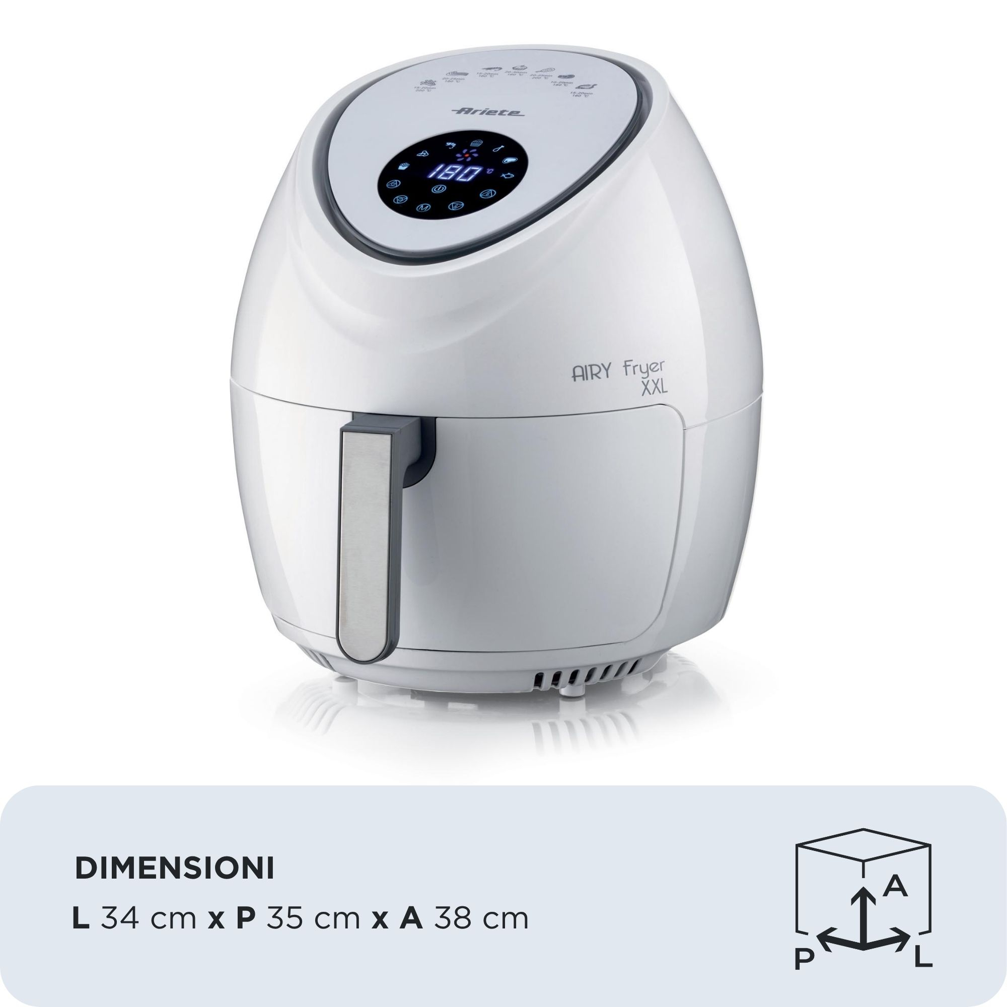 Ariete 4618 Airy Fryer XXL - Friggitrice ad Aria - Frigge 2,5 kg di Patatine Fritte - 7 Litri - Cottura Senza Olio e Grassi - 1800 Watt - Bianco. Tipo di prodotto: Friggitrice ad aria calda, Capacità: 5,5 L, Capacità friggitrice: 2,5 kg. Tipo di costruzione: Singolo, Colore del prodotto: Acciaio inox, Bianco, Tipo di controllo: Touch. Tipo di display: LCD. Potenza: 1800 W. Larghezza: 225 mm, Profondità: 390 mm, Altezza: 375 mm
