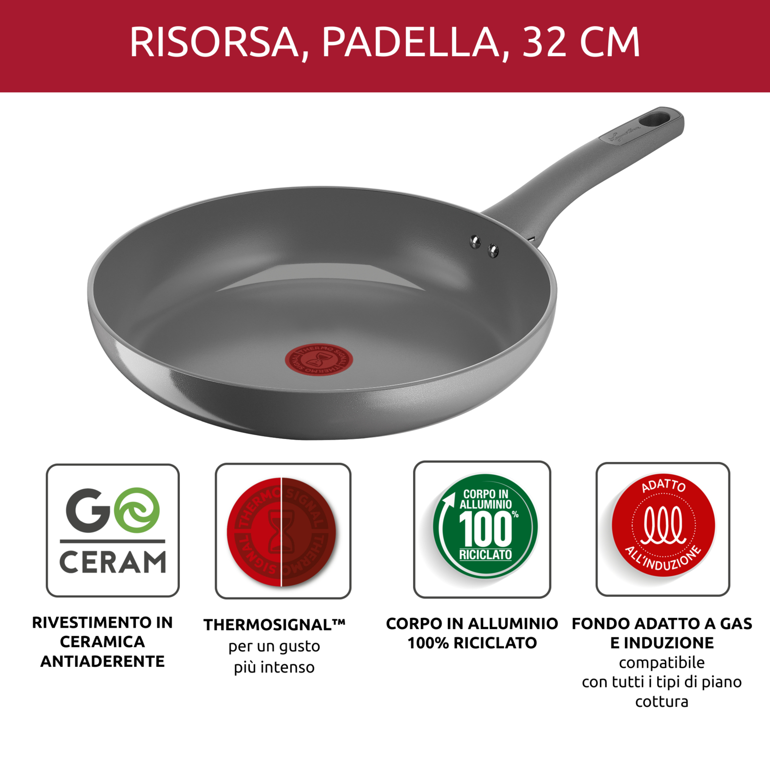 Le padelle della gamma Risorsa sono realizzate con corpo in alluminio riciclato al 100% e con materiali riciclabili. Il pack è realizzato con fibra riciclata e riciclabile.