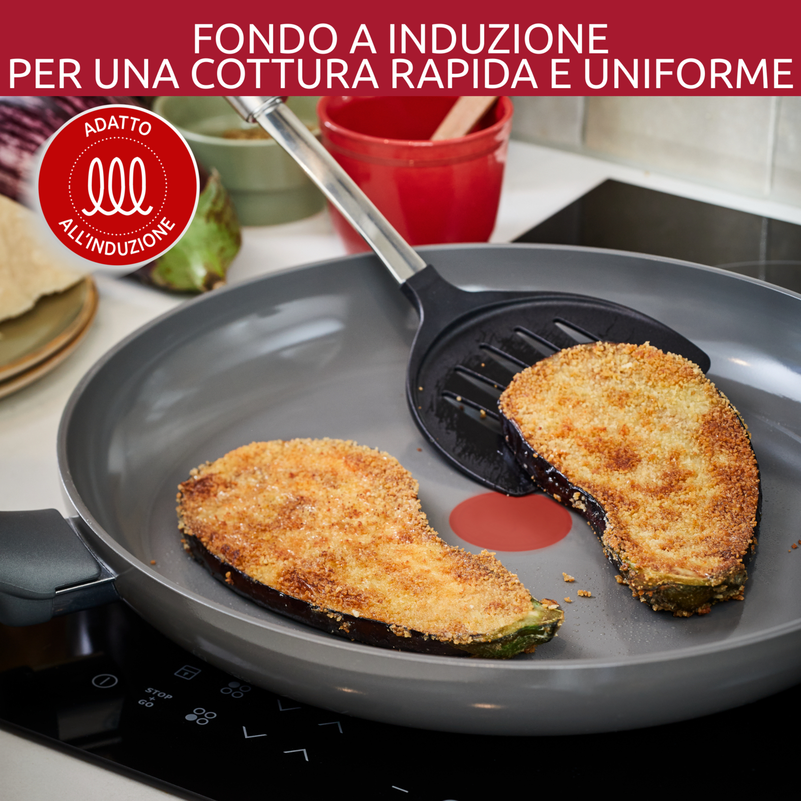 Il fondo a induzione di Lagostina assicura una diffusione del calore rapida e ottimale su tutta la superficie della padella, per piatti deliziosi cucinati sempre alla perfezione.