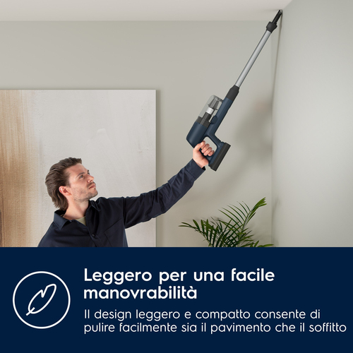 Il nostro aspirapolvere senza fili, leggero (solo 2,2 kg*) e potente, ti semplifica il lavoro. Il suo design ergonomico e compatto ti permette di manovrarlo in modo da pulire dal pavimento al soffitto.