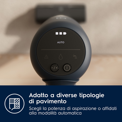 La Modalità Auto regola la potenza di aspirazione in autonomia in base ai tipi di superfici, ottimizzando l’uso di energia. Usufruisci di una transizione agevole dalle piastrelle ai pavimenti in legno e fino ai tappeti.