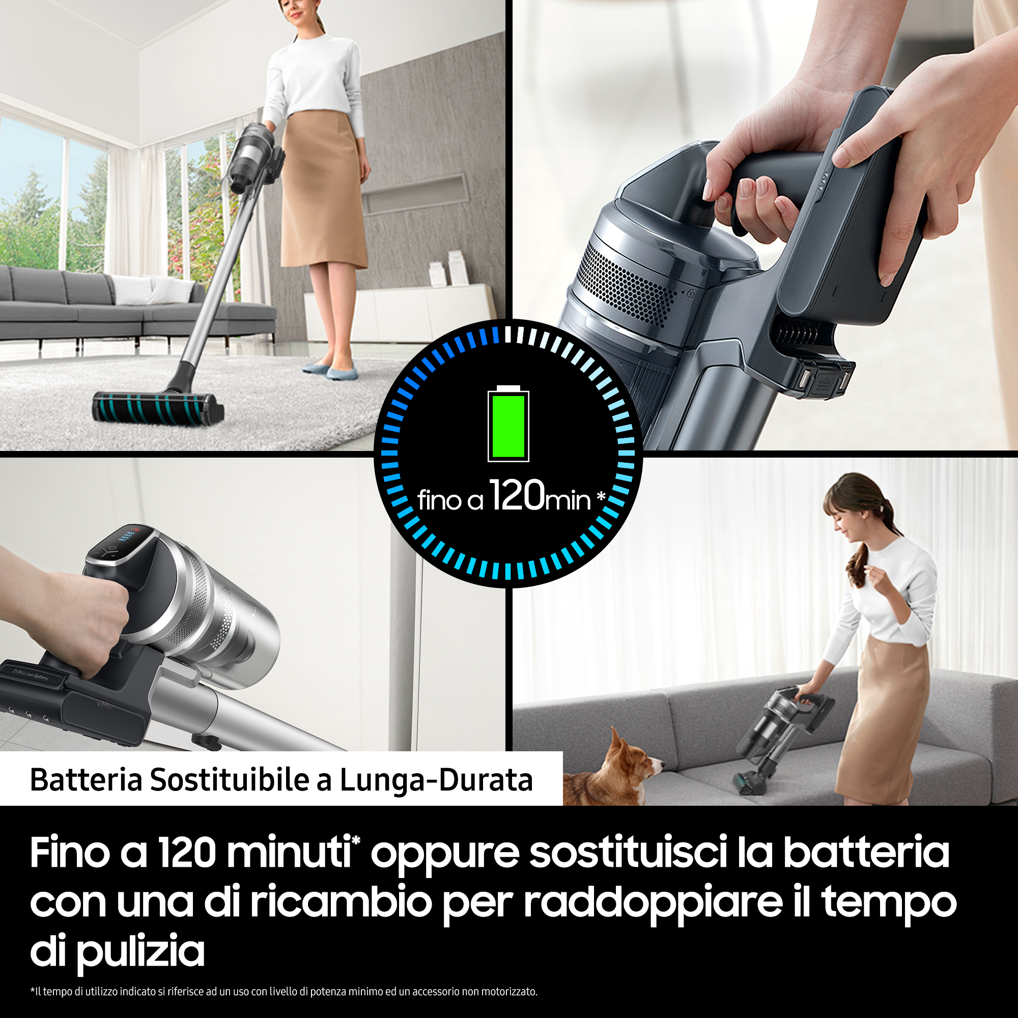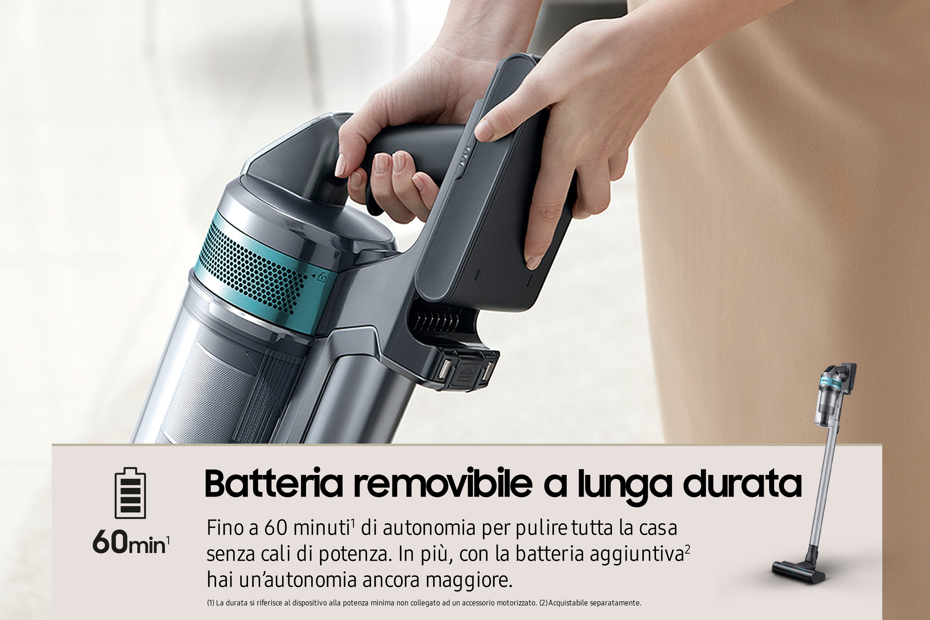Con la sua elevata capacità (3.000 mAh), la batteria di questo aspirapolvere può lavorare fino a 1 ora[7]. E se vuoi pulire per 2 ore consecutive, puoi sostituire la batteria con una di ricambio[8].
