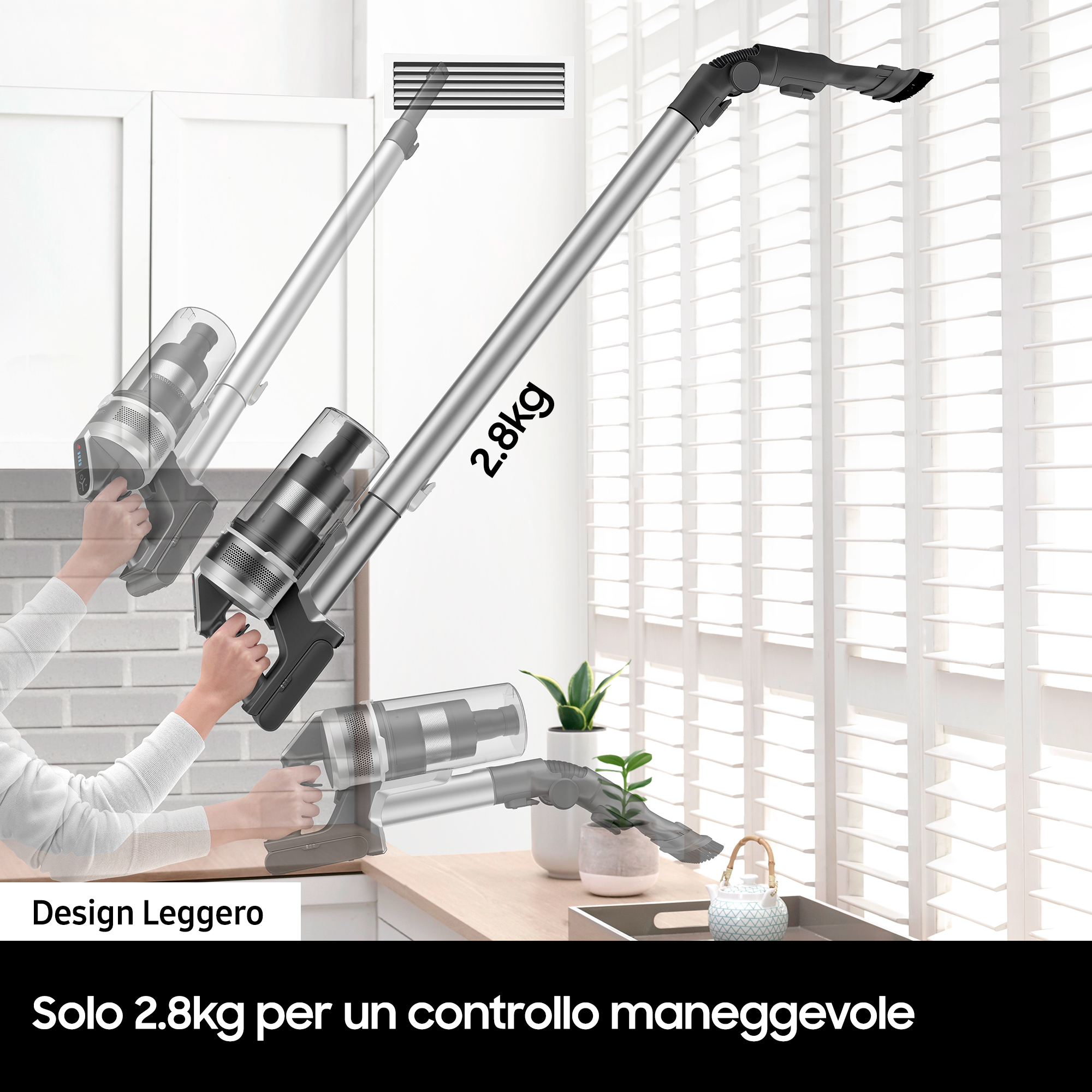 Pulisci la tua casa senza sforzo, grazie a un design maneggevole e leggero in grado di ridurre la tensione sul polso. Il corpo della scopa pesa solo 1,66 kg, il 12% in meno[10] rispetto ai tradizionali aspirapolvere Samsung. In questo modo puoi pulire facilmente tutta la casa.