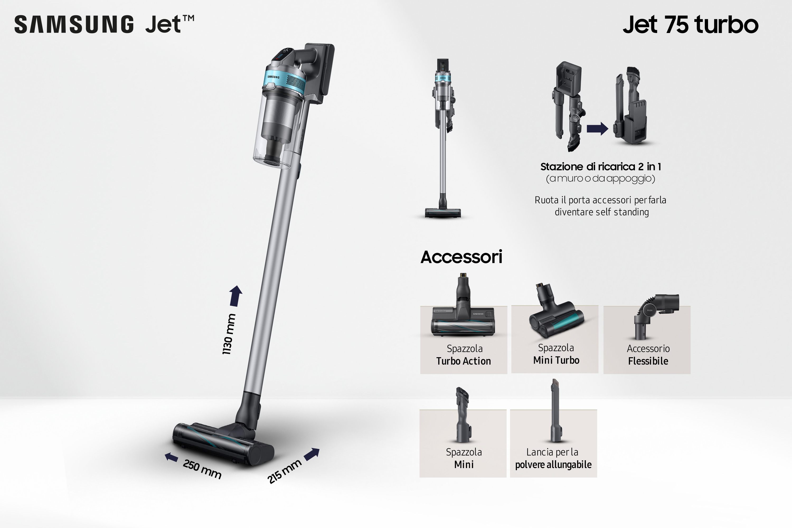 Samsung Aspirapolvere senza filo Jet™ 75 turbo 200aW VS20T7531T1. Tipo di prodotto: Aspirapolvere elettrica, Tipo di contenitore della polvere: Senza sacchetto, Colore del prodotto: Nero, Cromo, Colore menta, Colore foglia di tè. Tipo di pulizia: Secco, Sistema di filtraggio dell'aspirapolvere: HEPA, Metodo di separazione dello sporco: Multiciclonico. Alimentazione: Batteria, Massima potenza in entrata: 550 W, Tecnologia batteria: Ioni di Litio. Quantità per pacco: 1 pz. Larghezza: 250 mm, Profondità: 215 mm, Altezza: 1130 mm