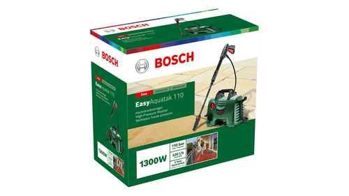 Bosch EasyAquatak 110. Fattore di forma: Compatta, Alimentazione: Elettrico, Lunghezza tubo: 3 m. Pressione operativa (max): 110 bar, Potenza motore: 1300 W, Massima temperatura acqua: 40 °C. Larghezza: 376 mm, Profondità: 398 mm, Altezza: 204 mm. Tipo di imballo: Scatola