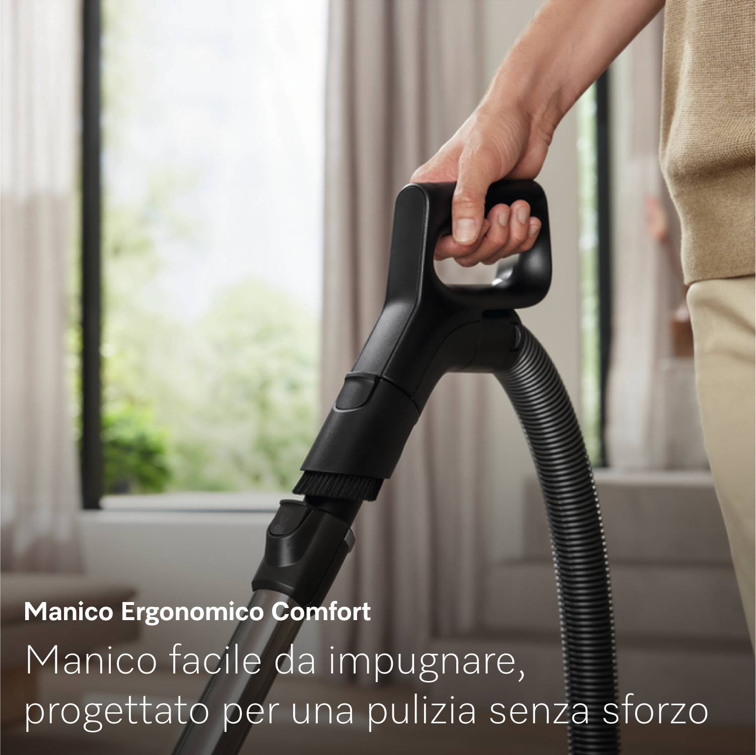 Grazie all'innovativa tecnologia di filtraggio e ai sacchetti polvere abbinati, ottieni un'igiene totale della casa, con una resa del filtro del 99,99 %2. Il sistema ComfortFit facilita l'inserimento dei sacchetti, mentre la chiusura sicura garantisce che non fuoriesca polvere e che il sacchetto possa essere sostituito in modo particolarmente igienico. Inoltre, i nuovi sacchetti polvere sono realizzati con più dell'80 % di materiale riciclato.