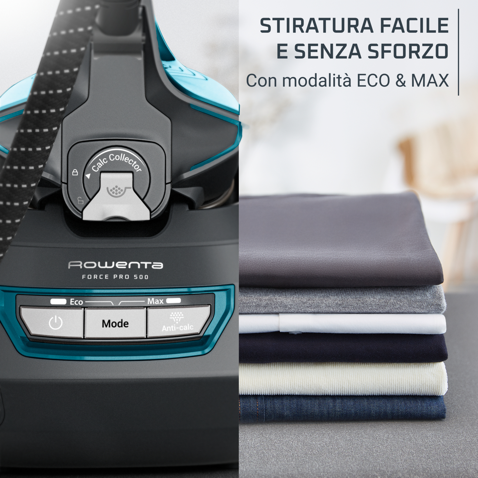 Il generatore di vapore Rowenta Force Pro 500 unisce un potente getto di vapore a un design intuitivo, per garantire risultati impeccabili su ogni tessuto La pressione di 8 bar elimina le grinze in un attimo, mentre il colpo di vapore da 600 g/min affronta con facilità anche le pieghe più ostinate. Attiva la modalità Eco per risparmiare fino al 50% di energia e vivi un’esperienza di stiratura ottimizzata grazie alle impostazioni semplificate (ECO e MAX), selezionabili direttamente dalla base — senza bisogno di regolare manualmente la temperatura.*