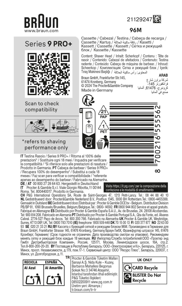 Braun Series 9 96M, Testina per rasatura, 1 testina/e, Nero, Acciaio inox, 18 mese(i), Braun, Series 9+ Pro
