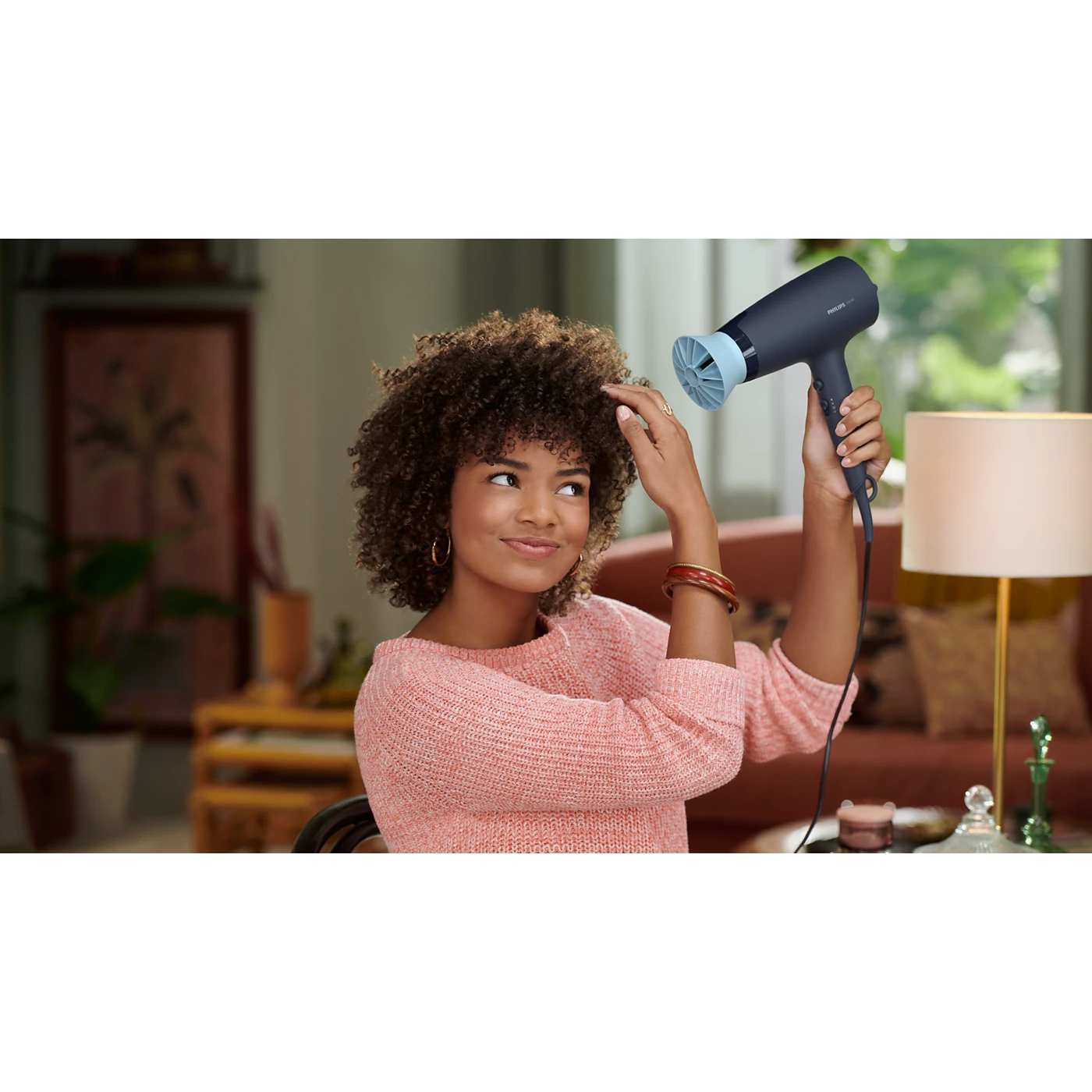 Philips 3000 series 3000 BHD360/20 Asciugacapelli. Tipo motore: dC. Colore del prodotto: Blu marino, Tipo di attaccatura: Anello di sospensione, Lunghezza cavo: 1,8 m. Potenza: 2100 W, Tensione di ingresso AC: 220-240 V. Altezza del beccuccio concentratore d'aria: 1,4 cm
