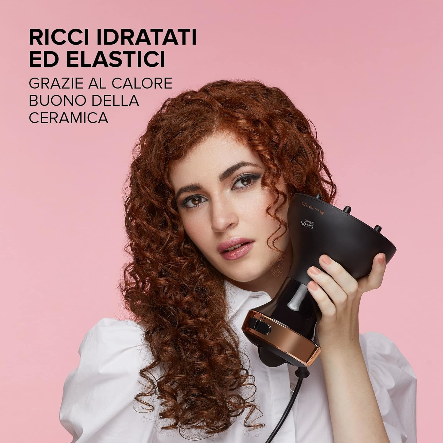 Asciuga delicatamente, per ricci composti e definiti. Capelli idratati ed elastici grazie al calore buono della ceramica.