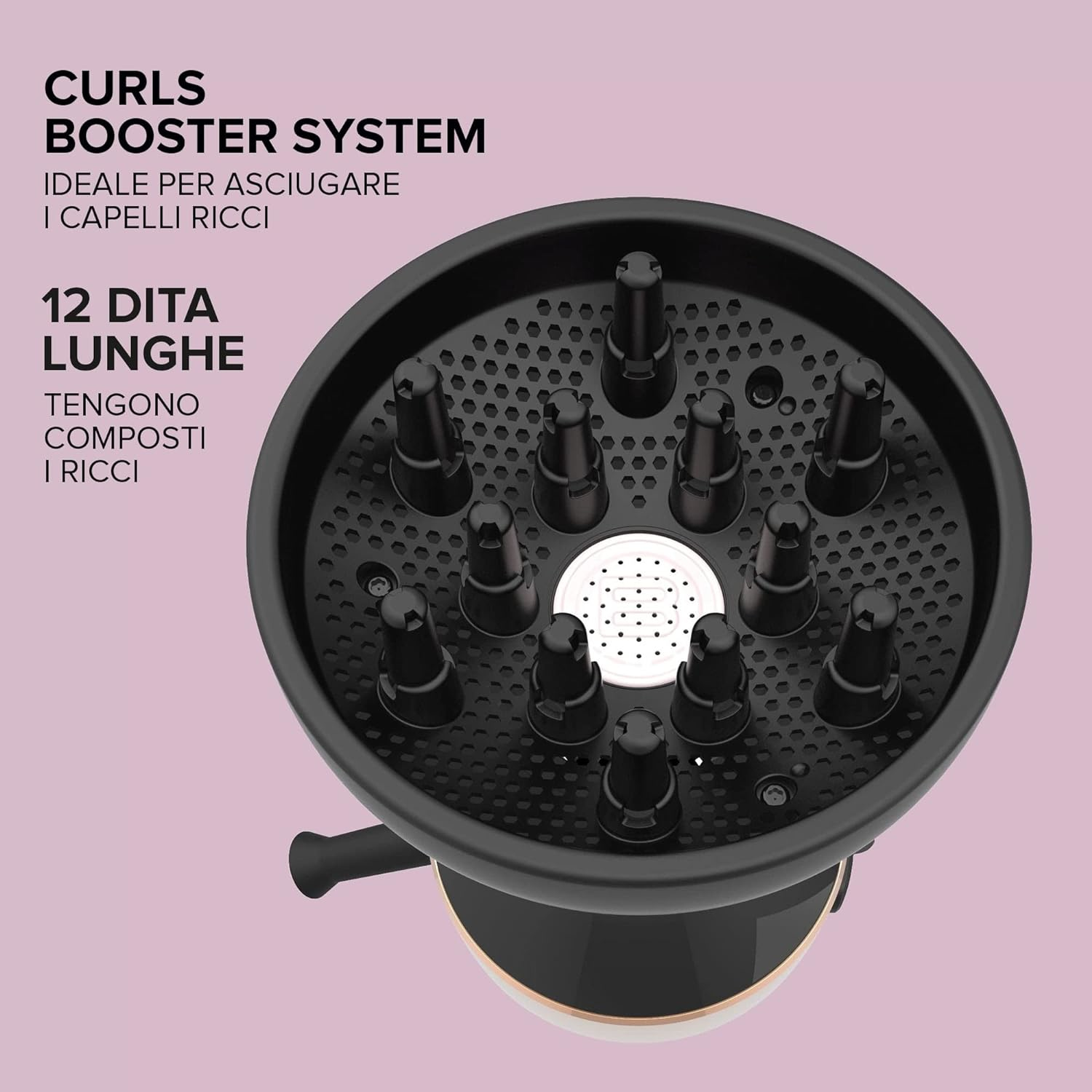 L’azione sinergica della particolare griglia forata che distribuisce uniformemente l’aria e delle 12 dita lunghe, che tengono in forma e composti i ricci, permette di asciugare con delicatezza i capelli: i tuoi ricci non si scompongono e mantengono la loro naturale elasticità!