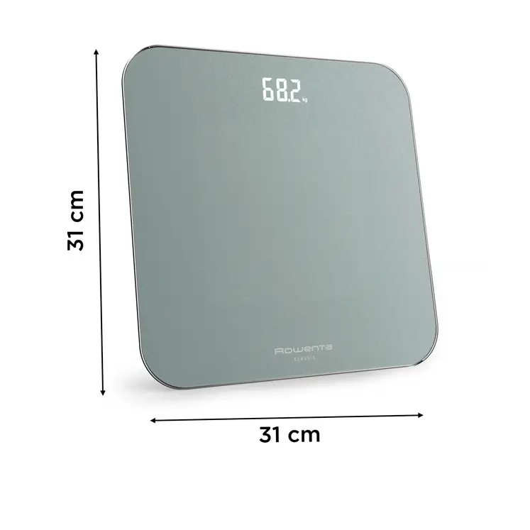 Rowenta Classic 2.0, Bilancia Da Bagno, Schermo Invisibile Facile da Leggere, Eucalipto, BS1903. Tipo: Bilancia pesapersone elettronica, Peso massimo (capacità): 180 kg, Precisione: 100 g. Tipologia display: LED. Tipologia alimentazione: Batteria, Tipo batteria: Mini Stilo AAA, Tecnologia batteria: Alcalino. Larghezza: 310 mm, Profondità: 310 mm, Altezza: 18 mm. Quantità per pacco: 1 pz, Larghezza imballo: 325 mm, Profondità imballo: 325 mm