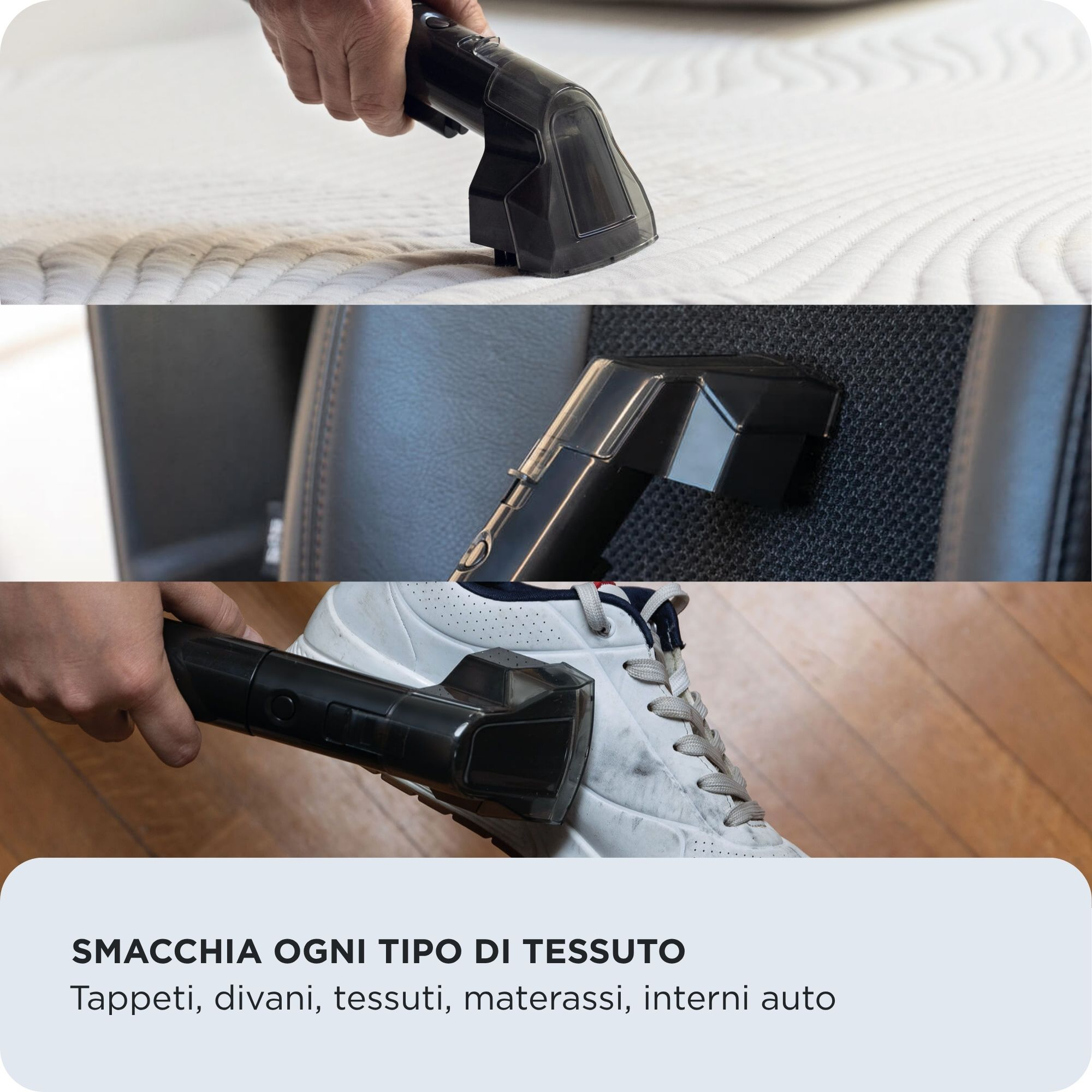 Potente, maneggevole ed efficace Spot Cleaner Heat Pro 750W è il pulitore per tappeti e tappezzerie che sconfigge le macchie ostinate e ti permette di dire addio allo sporco più difficile con pochi e semplici gesti. Otterrai una pulizia profonda grazie alla potente forza aspirante su varie superfici: sui tessuti e tappezzerie per ridare vita ai divani, poltrone e cuscini; agli interni auto per eliminare macchie e sporco; sui tappeti per rimuovere lo sporco incrostato e farli tornare come nuovi; sui materassi e cuscini per igienizzare e rinfrescare.Spot Cleaner Heat Pro 750W è leggero e maneggevole per trasportarlo comodamente e grazie al cavo lungo 5 metri hai completa libertà di movimento. Dispone di doppio serbatoio: uno da 1,1L per l’acqua pulita e uno da 0,8L per l’acqua sporca.