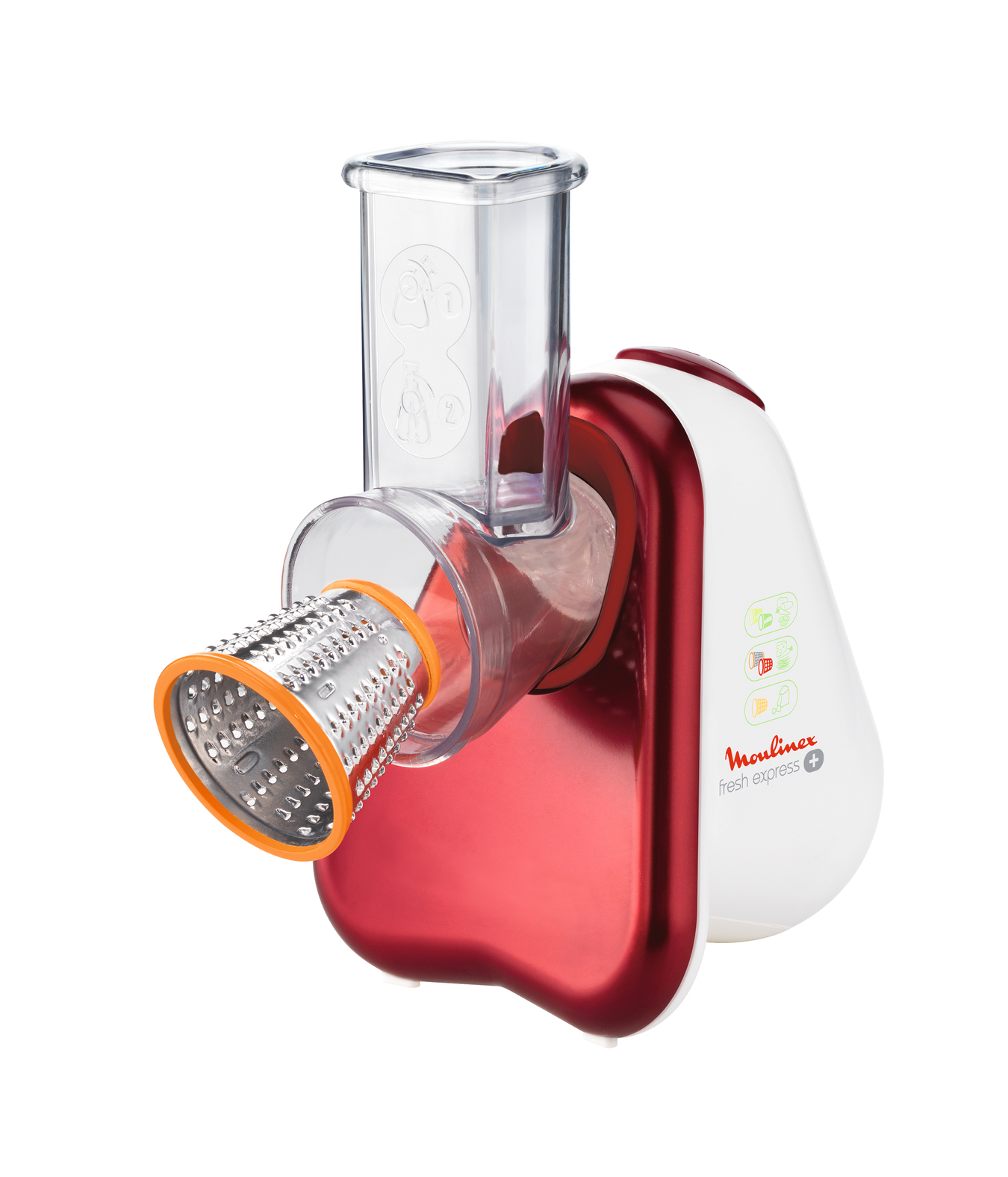 Preparare le tue cinque porzioni quotidiane non è mai stato più facile di così! Grazie ai cinque coni integrati, Fresh Express + ti permette di grattugiare, affettare o triturare verdure, frutta, formaggio o cioccolato direttamente nel piatto, pronti da mangiare. I coni sono di diverso colore, per consentire di riconoscere facilmente quello da utilizzare, aggiungendo anche un tocco di colore nella tua cucina. Fresh Express + è inoltre dotato di un ampio tubo di alimentazione; grazie a questo non è necessario tagliare prima le verdure! È davvero splendido sul piano di lavoro della tua cucina, con quella finitura rosso rubino, l'intelligente vano porta-cavo di alimentazione, il design compatto ed il pratico vano porta-accessori integrato.
