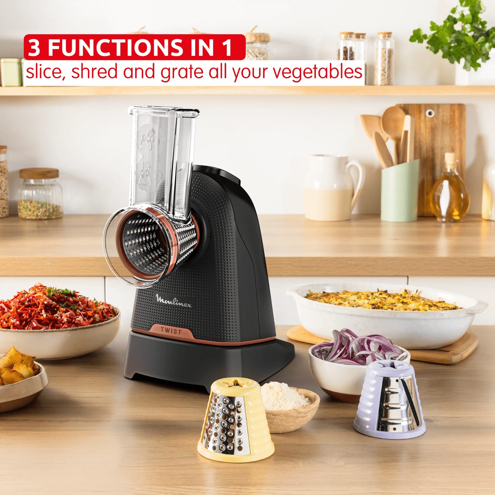 È pensato per affettare, sminuzzare o tagliare facilmente frutta e verdura o perfino grattugiare il formaggio, per cibi freschi e deliziosi ogni giorno.