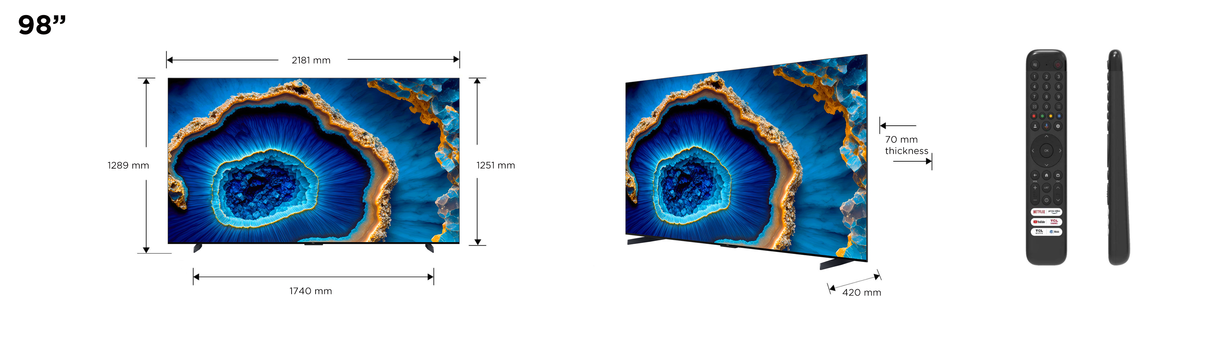 TCL C80 Serie Smart TV Mini LED 4K 98" 98C805, 144Hz, audio Onkyo con subwoofer, Google TV. Dimensioni diagonale schermo: 2,49 m (98"), Risoluzione del display: 3840 x 2160 Pixel, Tipologia HD: 4K Ultra HD, Tecnologia display: LED, Forma dello schermo: Piatto, Tipo di retroilluminazione LED: Mini LED. Smart TV. Tecnologia di interpolazione del movimento: PPI (Picture Perfomance Index) 4000, Luminosità schermo: 1500 cd/m², Tempo di risposta: 5,7 ms, Rapporto d'aspetto nativo: 16:9. Formato del segnale digitale: DVB-C, DVB-S2, DVB-T2. Wi-Fi, Collegamento ethernet LAN. Colore del prodotto: Nero