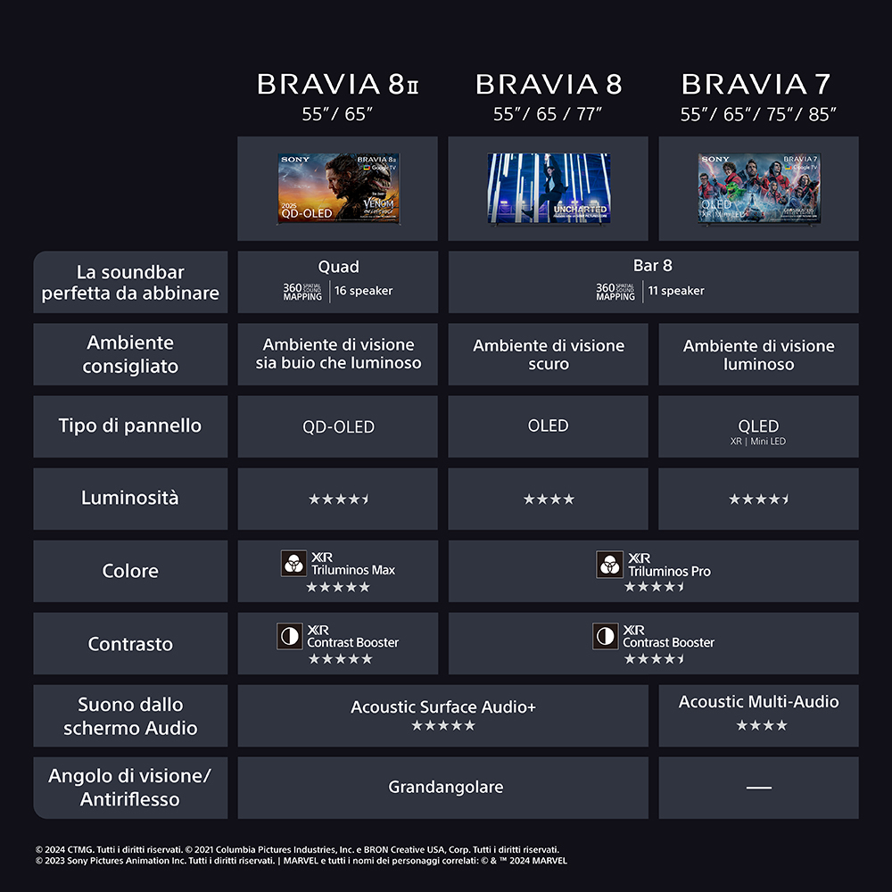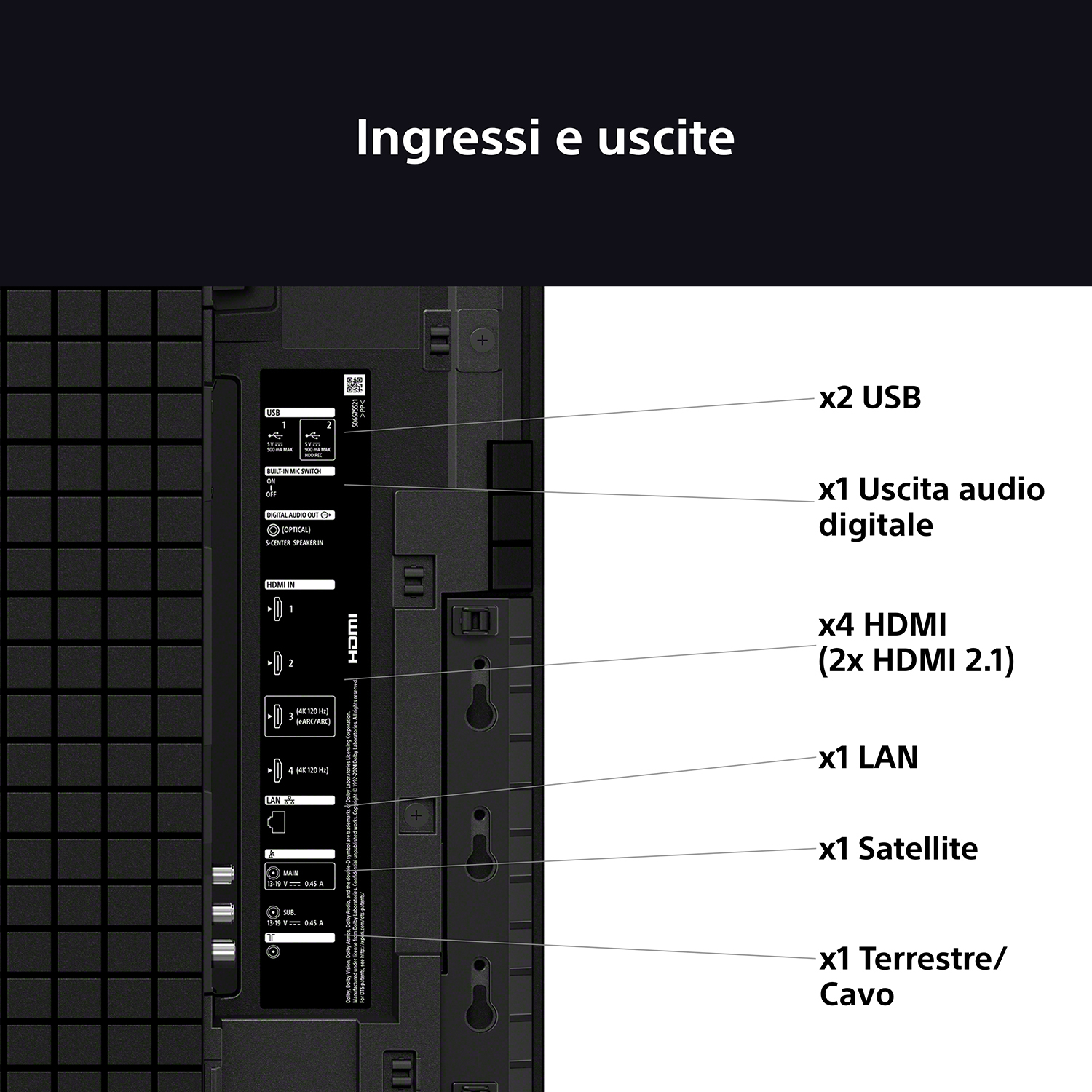 Sony K-55XR8M2. Dimensioni diagonale schermo: 139,7 cm (55"), Risoluzione del display: 3840 x 2160 Pixel, Tipologia HD: 4K Ultra HD, Tecnologia display: OLED, Forma dello schermo: Piatto. Smart TV. Tecnologia di interpolazione del movimento: Movimento OLED, Rapporto d'aspetto nativo: 16:9. Formato del segnale digitale: DVB-C, DVB-S, DVB-S2, DVB-T, DVB-T2. Wi-Fi, Collegamento ethernet LAN. Colore del prodotto: Nero
