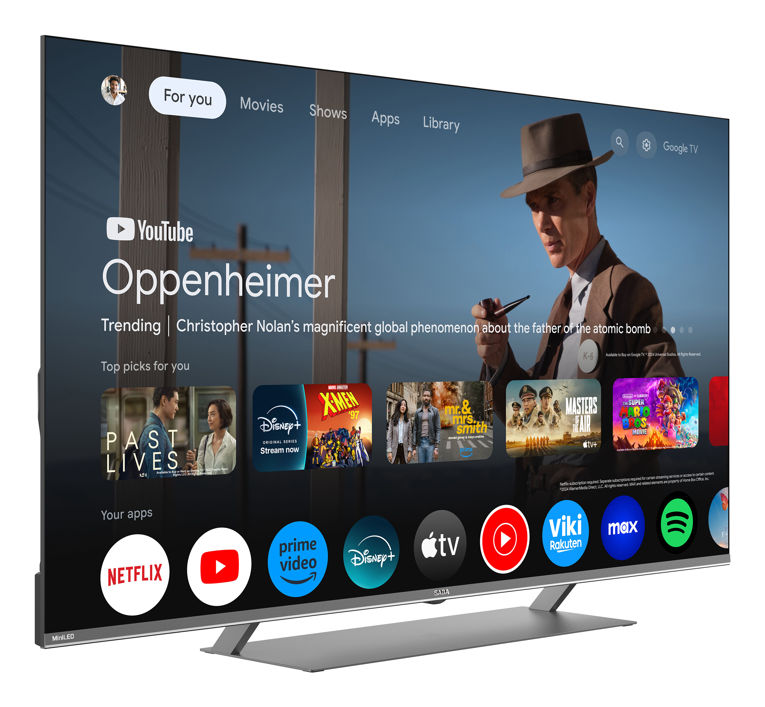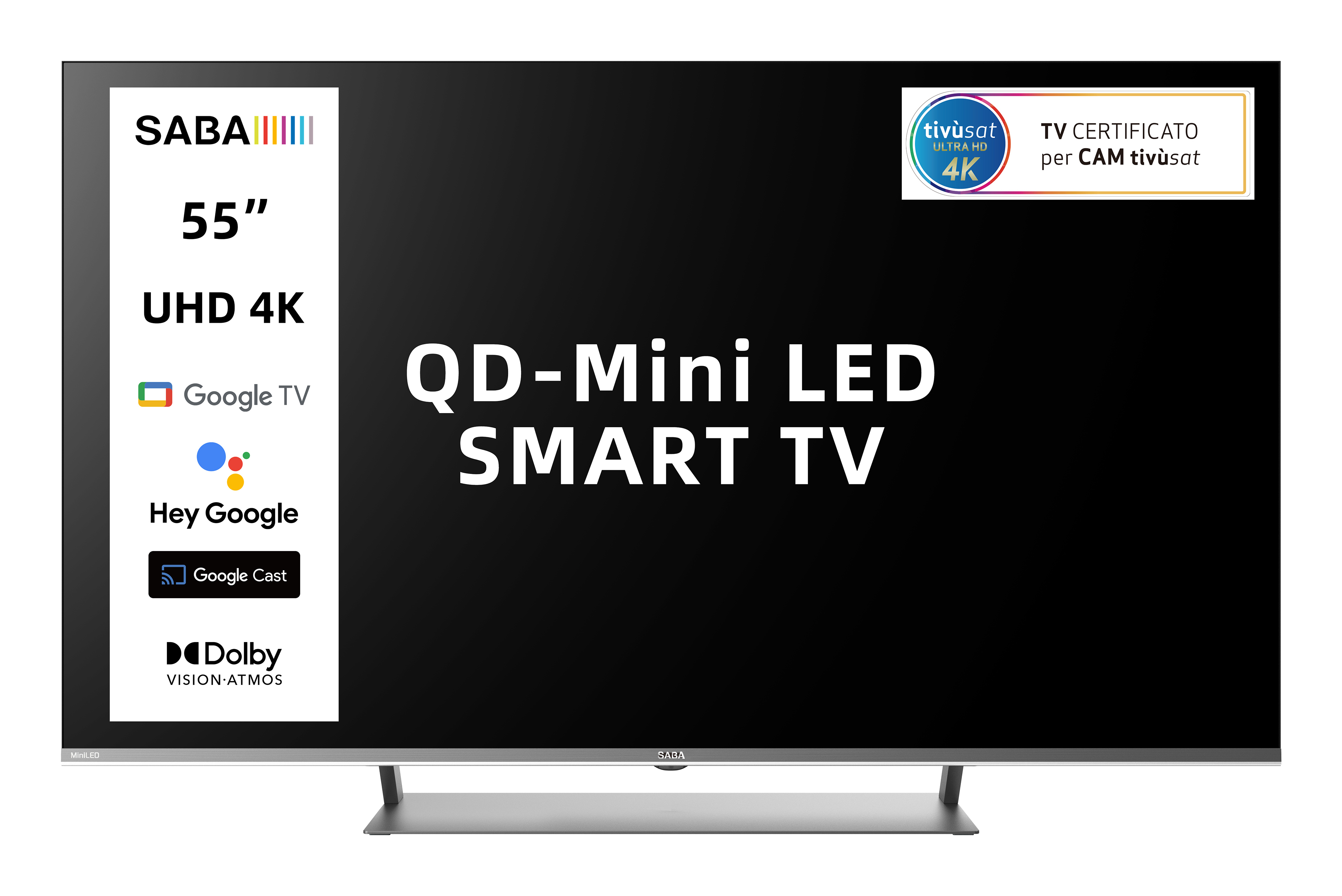 SABA SMART TV QD-MiniLED 55" ULTRA HD 4K, GOOGLE TV 5.0, Dolby Vision/Atmos, Triplo ter DVBT2/C/S2 HEVC MAIN10, Certificato TivuSAT, Piedistallo centrale