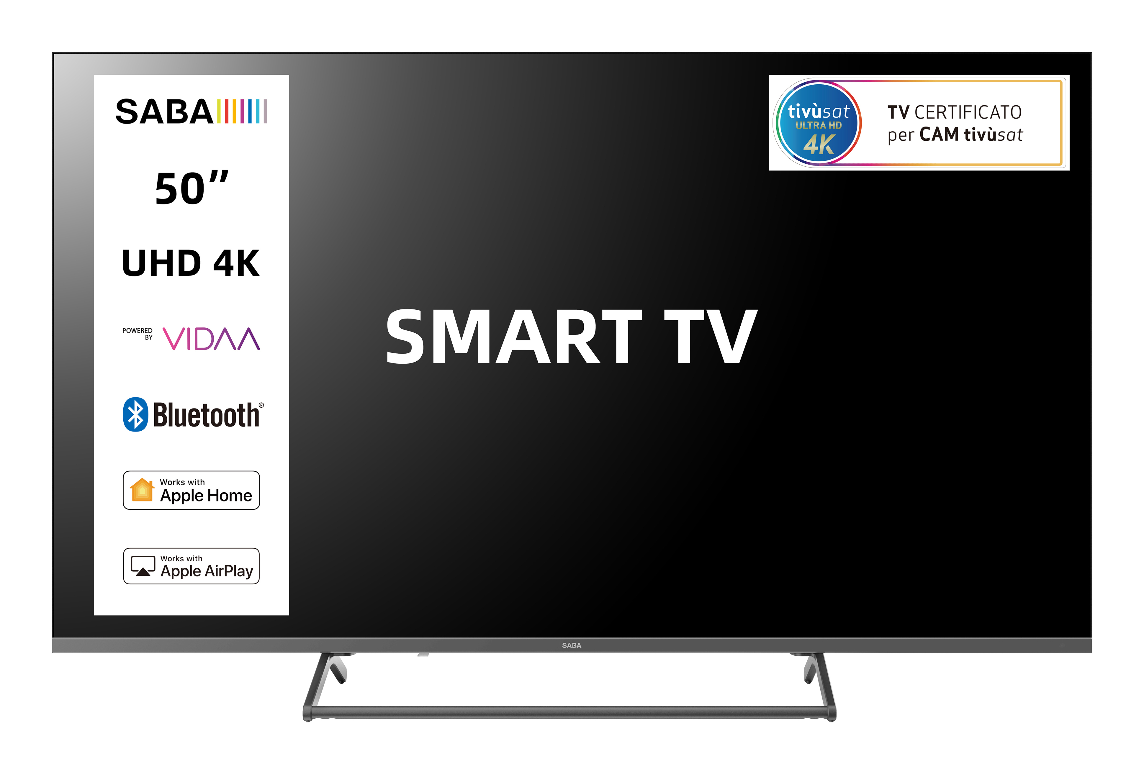 SABA SMART TV 50" ULTRA HD 4K, Sistema operativo VIDAA, Triplo ter DVBT2/C/S2 HEVC MAIN10, Certificato TivuSAT, Piedistallo centrale, Dolby Audio