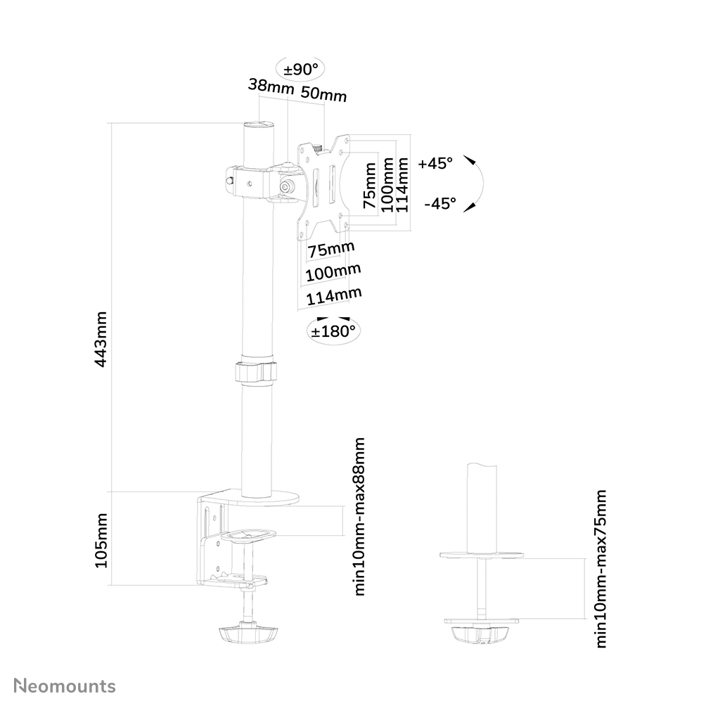 Neomounts by Newstar Supporto da scrivania per monitor. Montaggio: Morsa/Bullone di ancoraggio, Peso massimo (capacità): 8 kg, Capienza minima dimensioni dello schermo: 25,4 cm (10"), Capienza massima dimensioni dello schermo: 81,3 cm (32"), Compatibilità interfaccia di montaggio (min): 75 x 75 mm, Compatibilità interfaccia di montaggio (max): 100 x 100 mm. Regolazione altezza, Inclinazione: 0 - 90°. Colore del prodotto: Nero